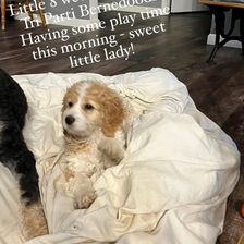 Jem a five-year-old standard Bernedoodle who has been with us since the beginning. This is her third litter. She is a lover, free spirited and a wonderful natural mother and companion she raises wonderful loving dogs who have this wonderful cream color. She has some great characteristics. We only do embark testing on our animals and they all are consistently kept up with their vet checks. Everybody is 100% healthy and gems litter is ready August 30 and please let me know. If we can help you. I welcome face-to-face contact through FaceTime Zoom whatever so people can see how we raise and care for our dogs. They are 100% socialized, potty trained, and ready to go out the door to you.