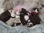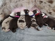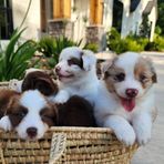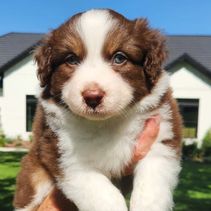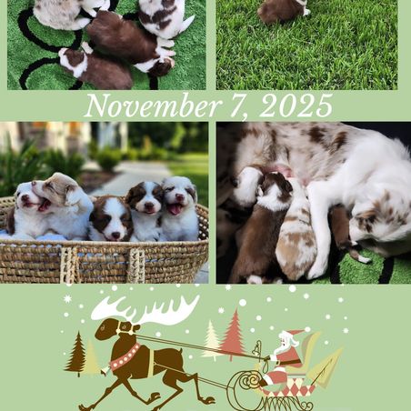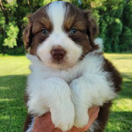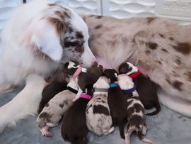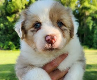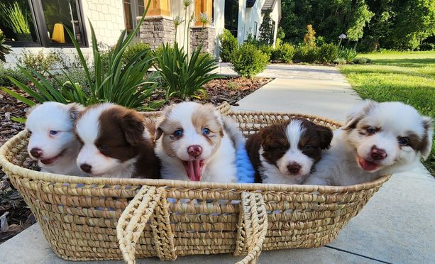 Our puppies include red & white, red merle, blue merle, black tri-color, and red tri-color. Colors will vary depending on the parent dogs.