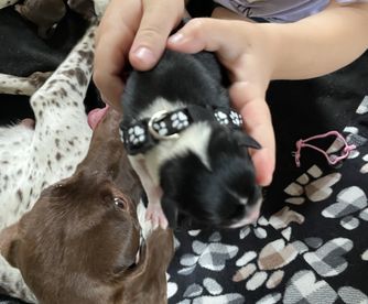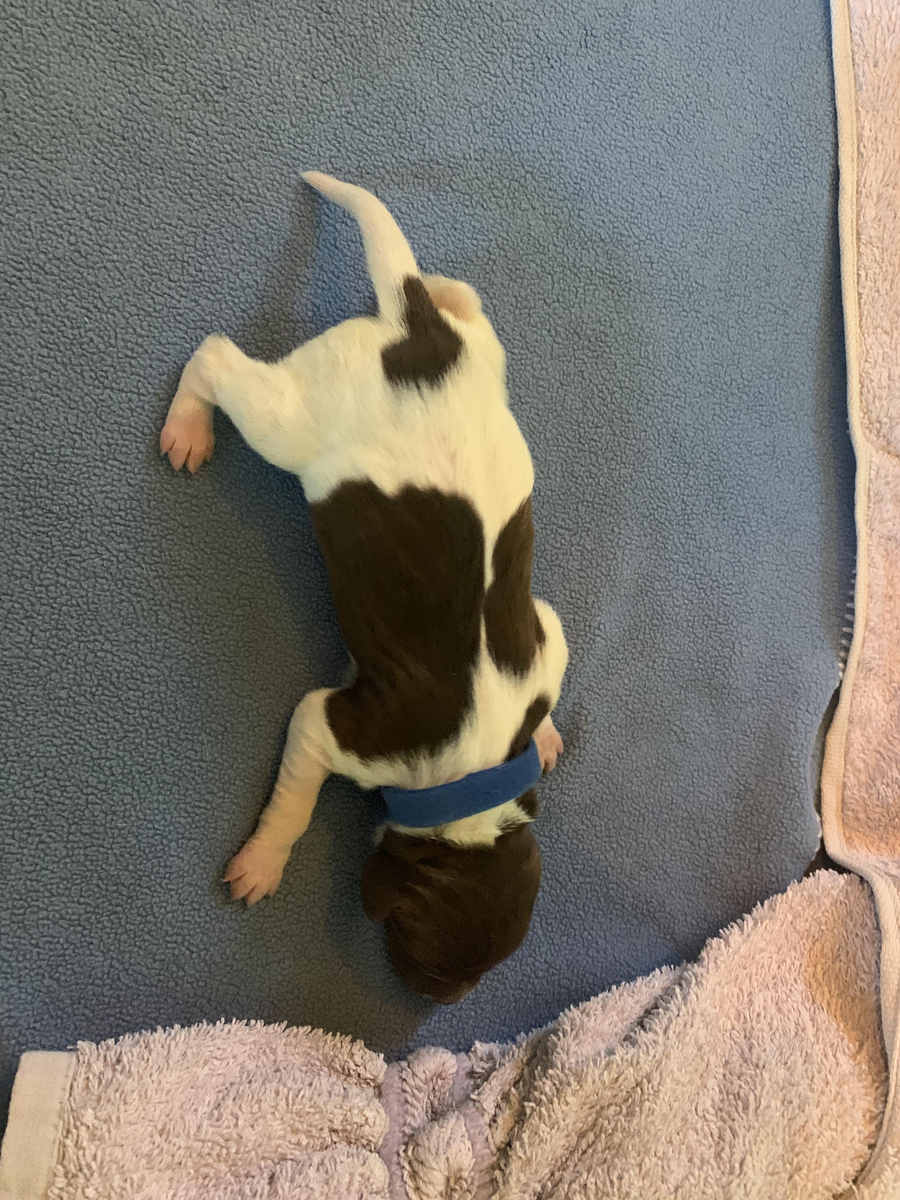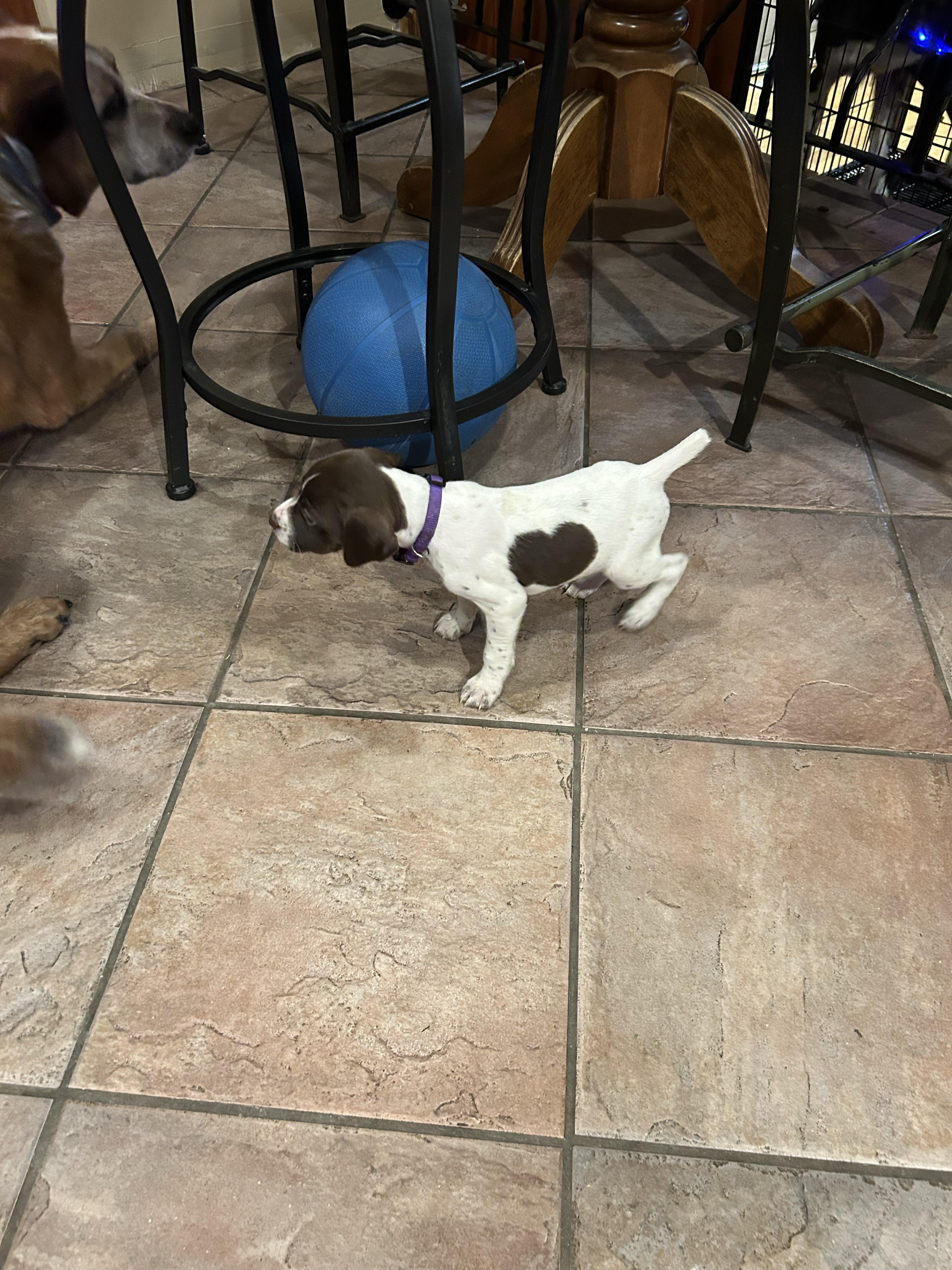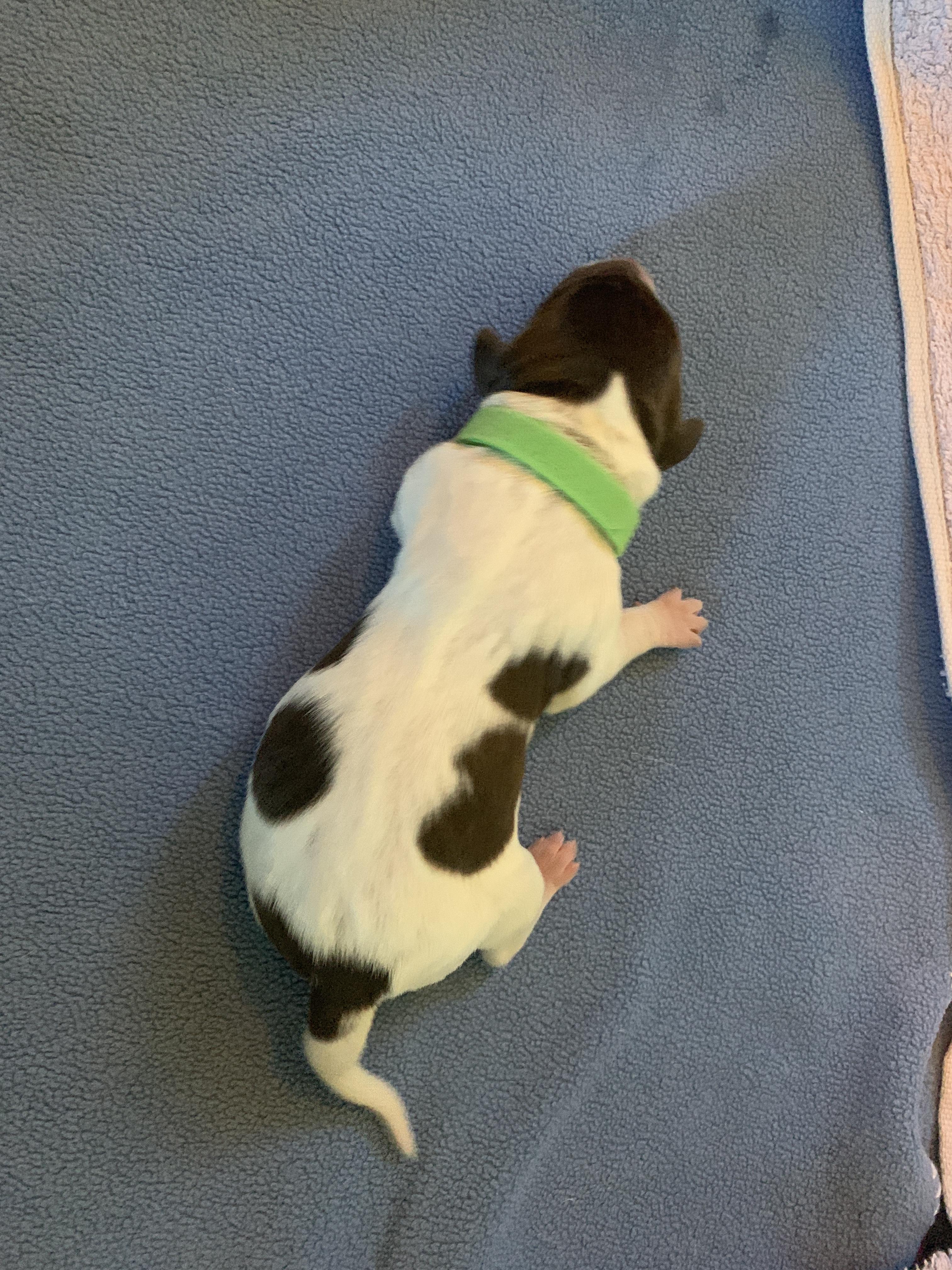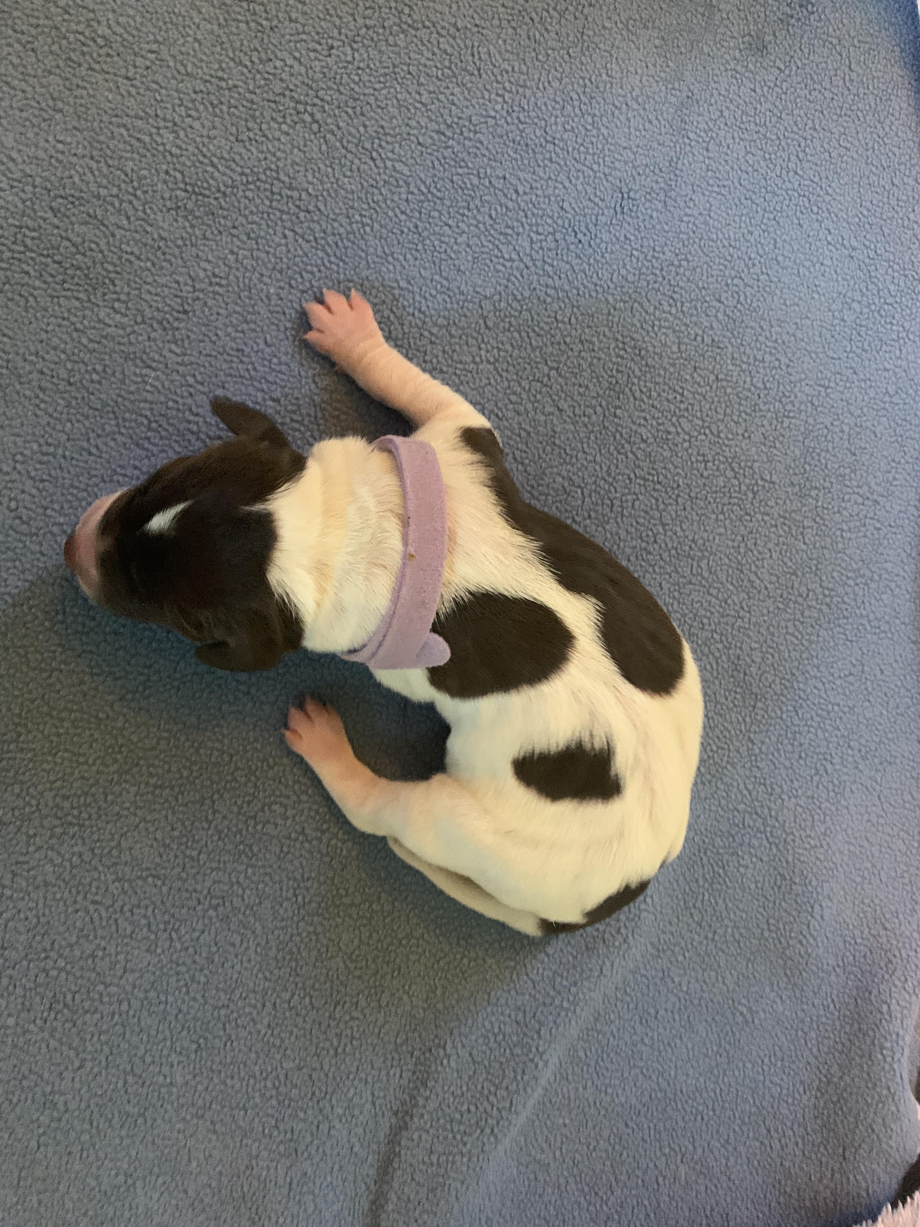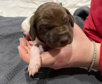 Our puppies include liver roan, liver and white, and white and liver. Colors will vary depending on the parent dogs.