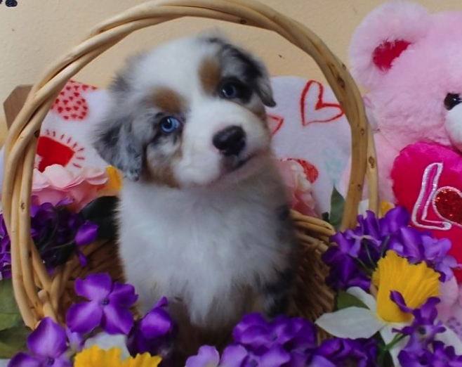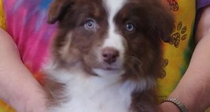Our Australian Shepherd puppies include black, red merle, blue merle, and red. Russell Terrier puppies include tri-color and white and tan. Colors will vary depending on the parent dogs.
