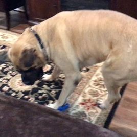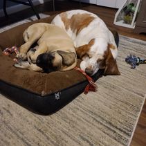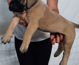 We were looking for a female English mastiff puppy to join our family and discovered precisely what we wanted at Tim’s Ozark Mountain Mastiffs. We had rejected breeder after breeder, just by looking at their breeding stock. First-class English mastiffs are strong, powerful, non-aggressive protectors for their families, but nowadays they are being bred too big, with massive chests, short legs and a linebacker’s body that’s guaranteed to bring pain and early death. Tim’s dogs have perfectly proportioned bodies --- sleek and sturdy, with long legs and solid, strong bodies. His mastiffs are welcomed as part of the family, which is as it must be because English mastiffs, like Tim’s, are protectors. Ozark Mountain dogs are shown with their people. Not only are Ozark Mountain dogs totally vetted, with complete paperwork guaranteeing their family heritage and their good health, but each is identified with its owner via being microchipped, so everyone knew which pup was ours. Tim came with his young son to bring our girl, during their state-to-state pup-delivery circuit. We drove up to meet him at our pre-arranged destination. They were right on time, gave us her paperwork along with a bag of puppy food, and confirmed our pup’s microchip ID via scanner. We paid via credit card, through “Good Dog” and then brought our happy, healthy new family member home. Mastiffs are a very old, very special kind of dog, bred to perform specific functions. These are physically powerful dogs that think for themselves, so their people must be strong-willed and able to train kindly. English mastiffs belong living with their families and must be handled firmly and gently because it is love for family that controls an English mastiff. Our 7-year-old male English mastiff, Shomer (in Jewish tradition, a “shomer” is a "guard" or "watchman"), and our 4-month-old Ozark Mountain girl are hitting it off perfectly, especially now that she’s gotten him wrapped around her paw. We named her “Ju-Ju”: In Louisiana, where we live, West African heritage in New Orleans, regards “juju” as “a magical or spiritual object, practice, or belief.” Yes, our Ju-Ju is a charmer, with her “fawn” coloration interspersed with black. In New Orleans she might be described as “a free pup of color.” She is most definitely a free-willed young lady, who is growing up strong and healthy, ready to take her place in our family. We are delighted! Ozark Mountain Mastiffs has earned our very highest recommendation. Photos show: Ju-Ju (at 2 1/2 months, when we brought her home) & Shomer