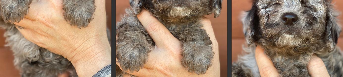 Updated pictures are loading!!!! Everyone is doing great!!! Litter training has been very successful!! Dry kibble is a favorite!!! Dash the Blue Merle male is charting to be Mini sized while the others seem to be nice thick healthy Toys!!!