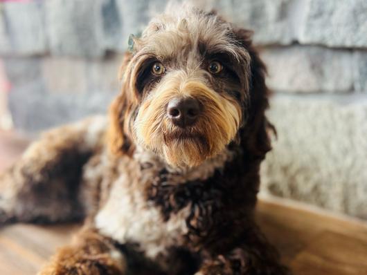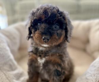 Wick is a AKC chocolate merle tri color miniature poodle. He is 13lbs full grown and genetically tested and clear.