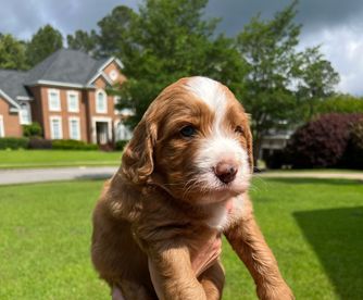 Brittany is a fantastic breeder. This is my first puppy from her. She was well informed and a great communicator. I feel like he has been given a really good foundation for me as a 3 family dog home. George is well rounded and has a great start on potty training. It has really made a difference. He is a great companion to my Lab. I am very pleased