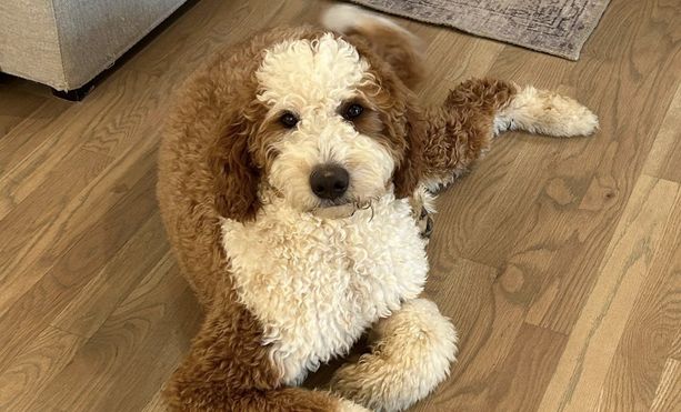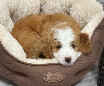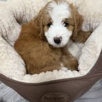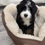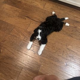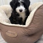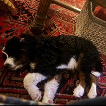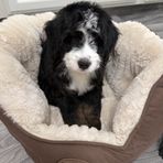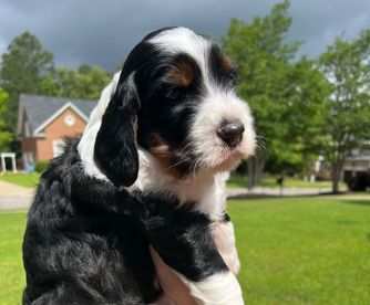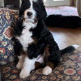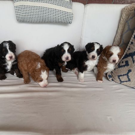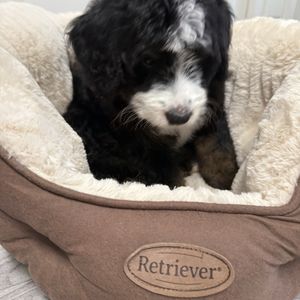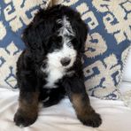 Not to be partial but this puppy might very well be the family favorite! He is the chunkiest little ball and pure chill. He has a great wide blocky snout and head that takes after the Bernese mountain Dog but of course will have the non shedding straighter coat with a touch of wave (from the poodle side) He is chill chill chill!