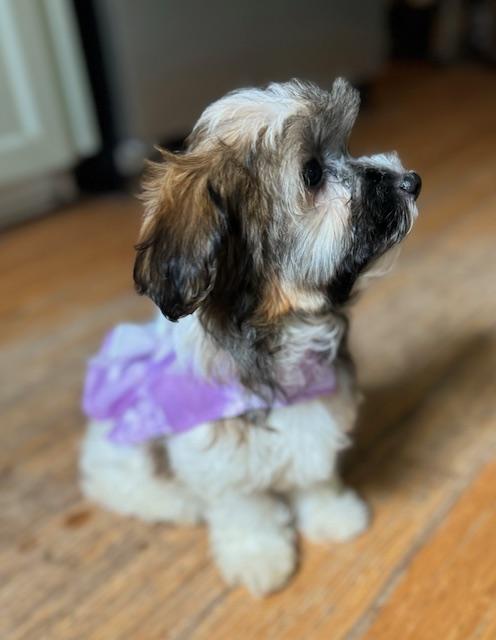 Bella is mostly white with some light gray/brown. She is small and very loving. She follows the kids around and is happiest when she is playing with them Shes not really into toys, but she will sit under a high chair and steal whatever the baby discards. She is a good mom and is checked out by our vet after each litter to ensure she is able to breed again. She is also AKC registered and a wonderful mom to her puppies.