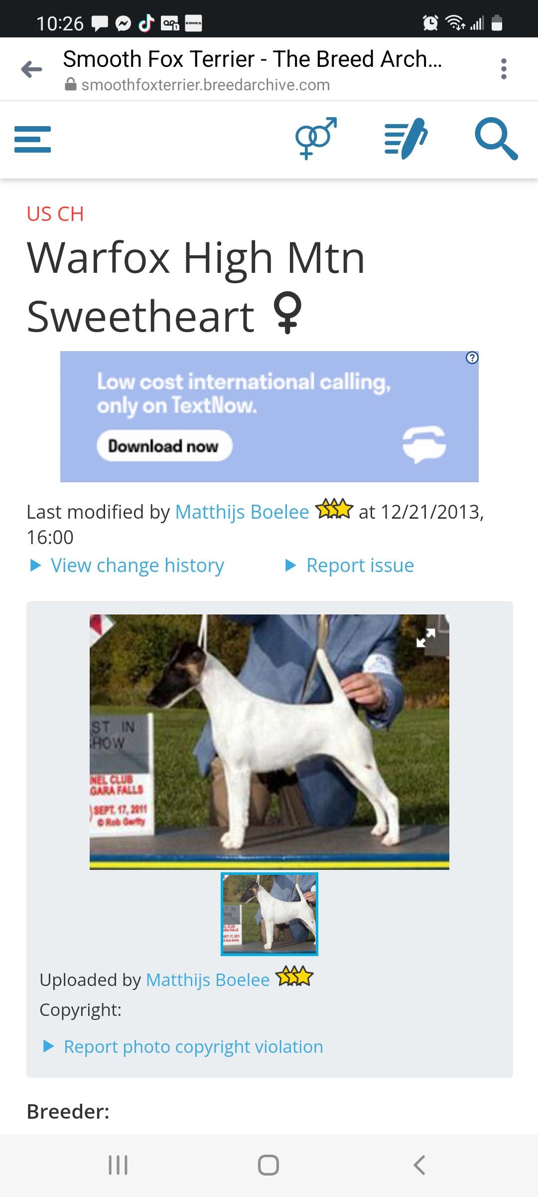 Ella is a female Smooth Fox Terrier. Carefully selected as a great representative of her breed, Debra decided to make her part of their program. Debra has passed Good Dog’s screening process, which involved a review of their breeding practices, environment, and the mental and physical health of their dogs.