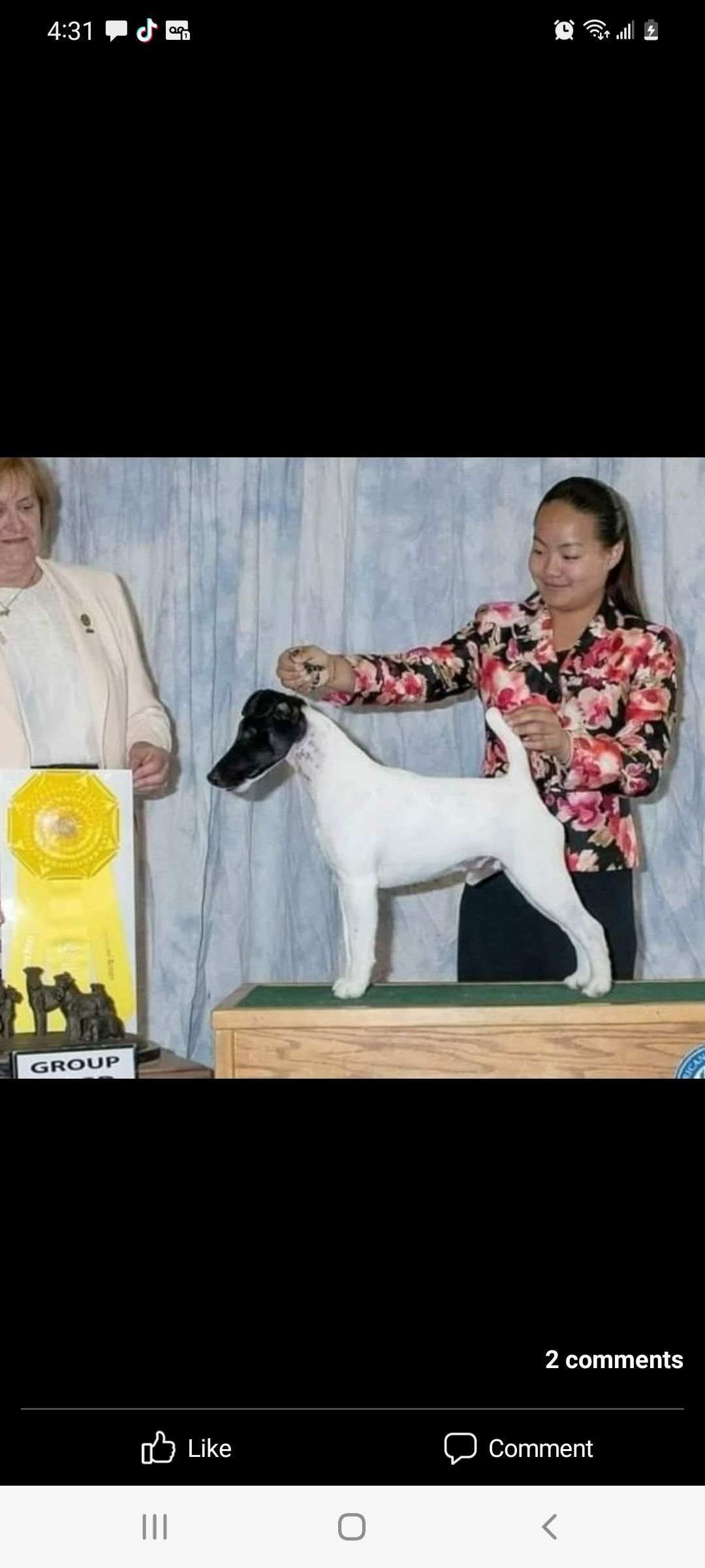 Sunny is a male Smooth Fox Terrier. Carefully selected as a great representative of his breed, Debra decided to make him part of their program. Debra has passed Good Dog’s screening process, which involved a review of their breeding practices, environment, and the mental and physical health of their dogs.