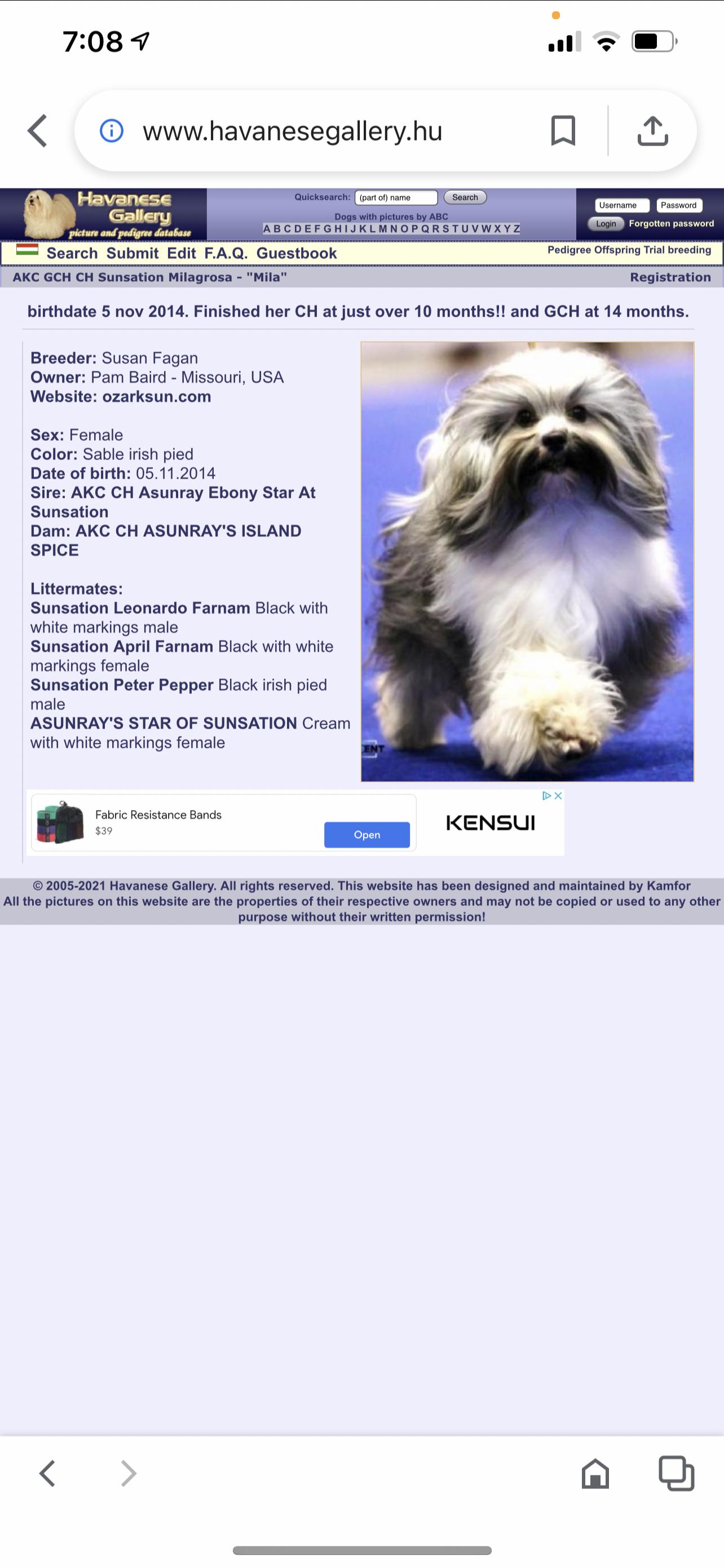 Mila is a female Havanese. Carefully selected as a great representative of her breed, Pam decided to make her part of their program. Pam has passed Good Dog’s screening process, which involved a review of their breeding practices, environment, and the mental and physical health of their dogs.