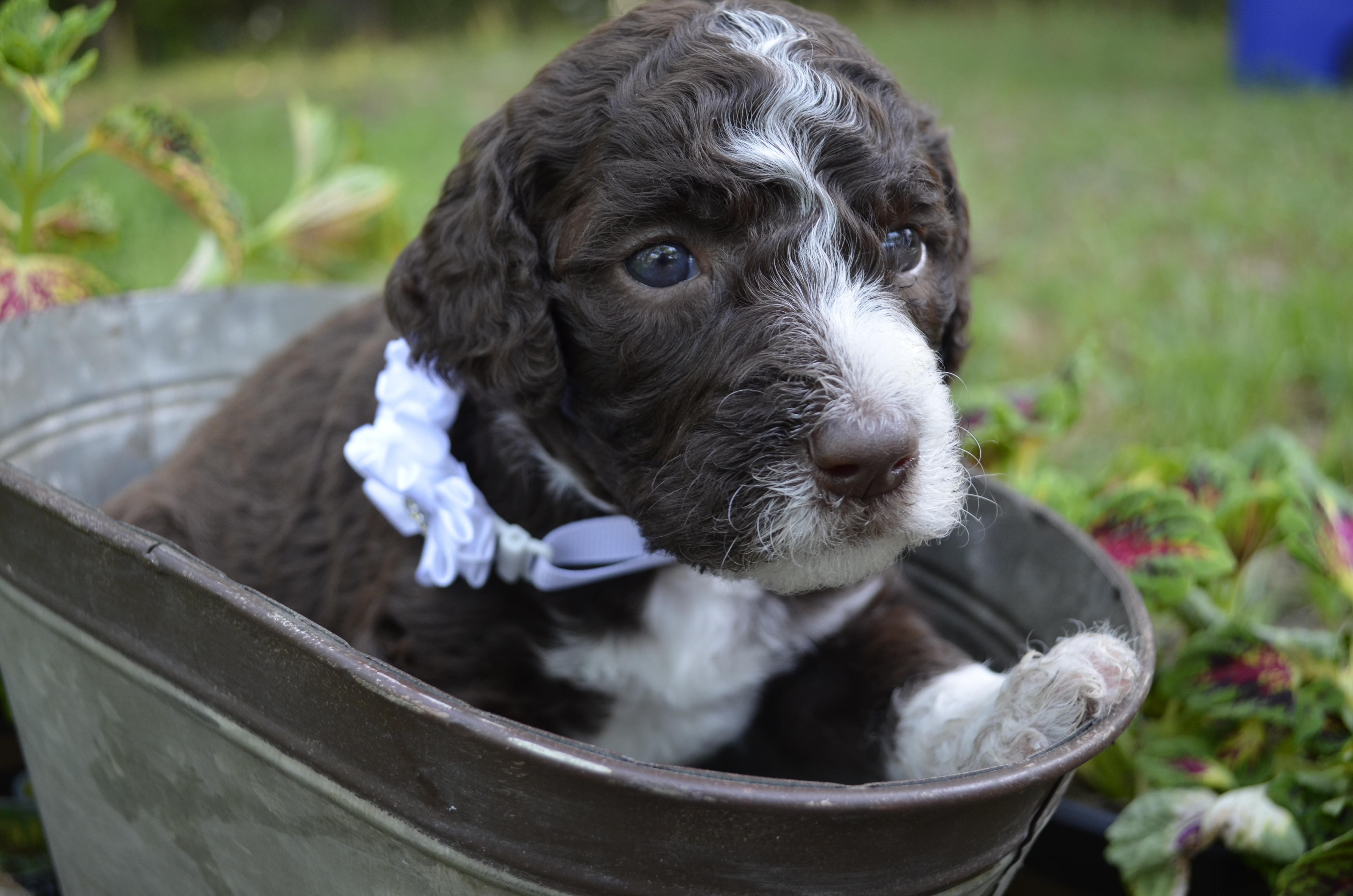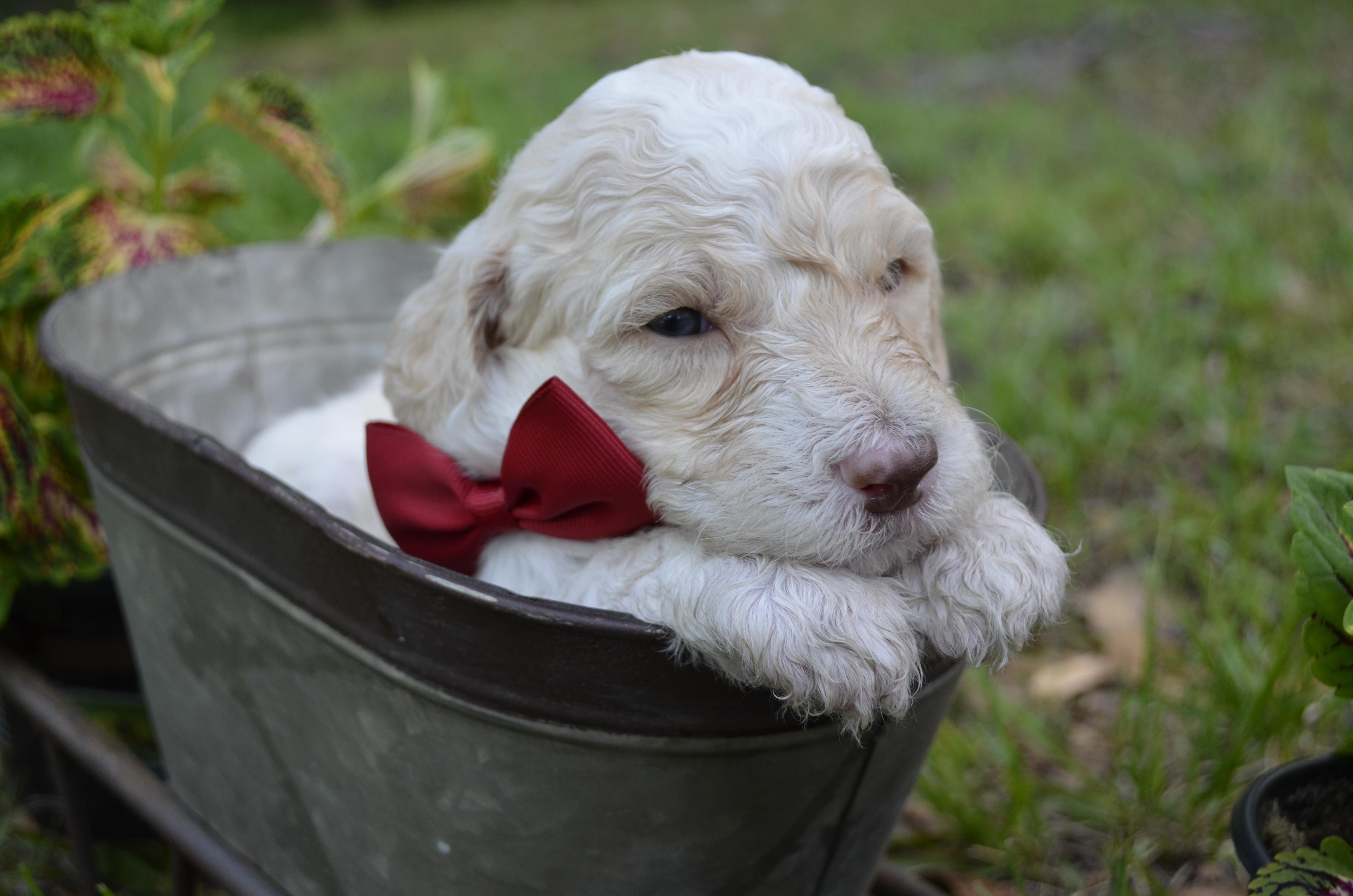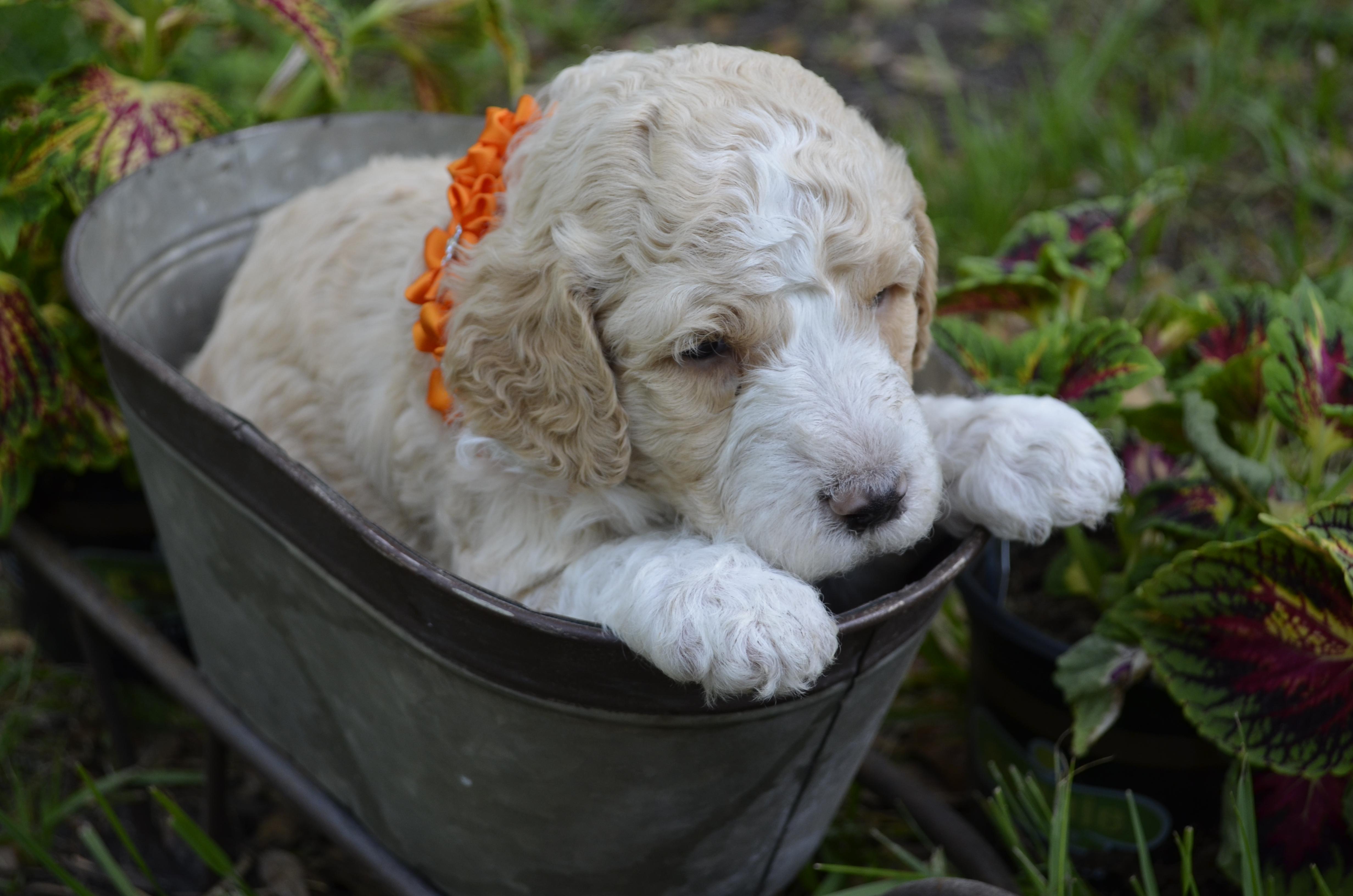 Our Sheepadoodle puppies are fawn and white. Poodle puppies include apricot and parti. Colors will vary depending on the parent dogs.