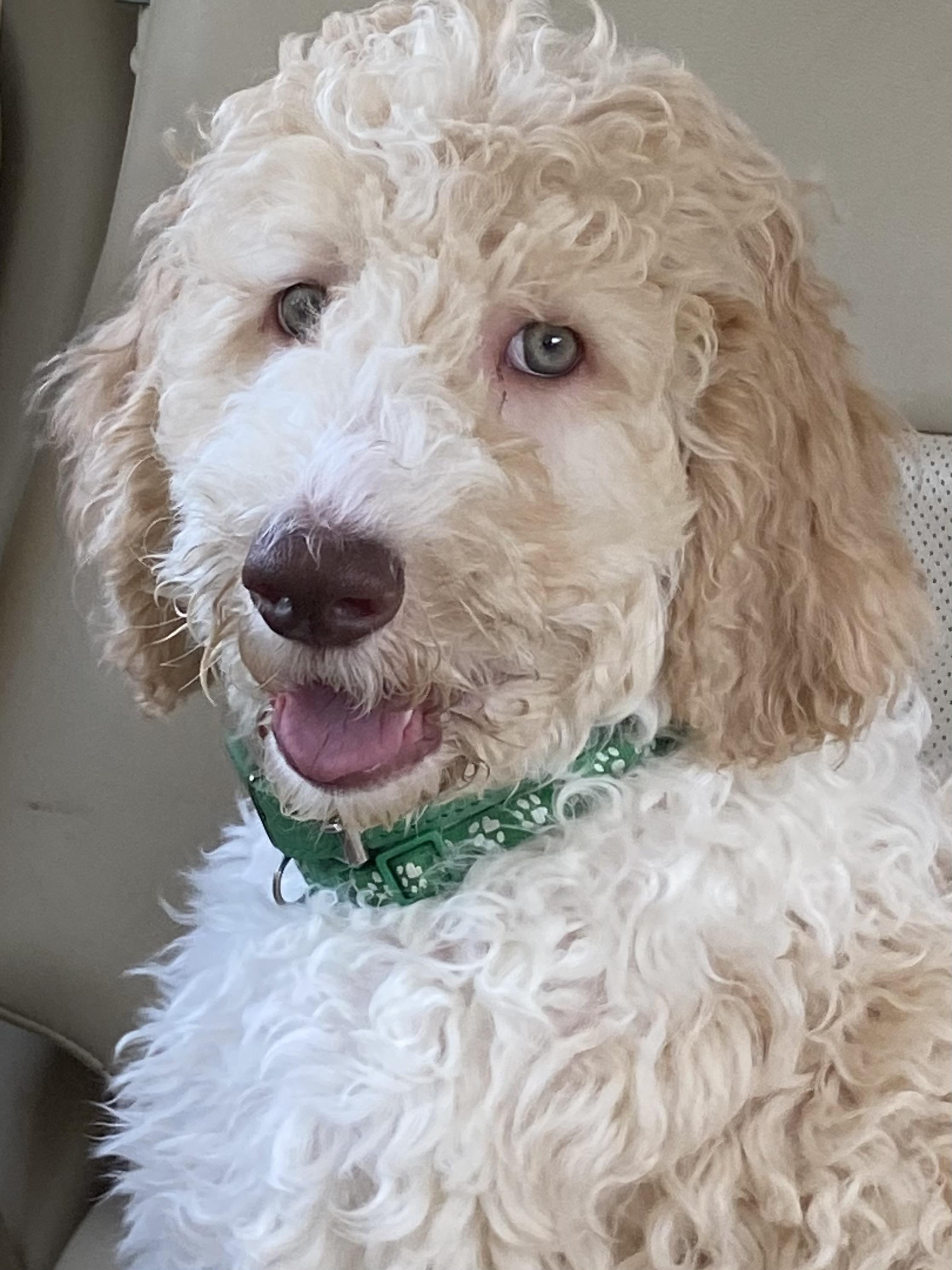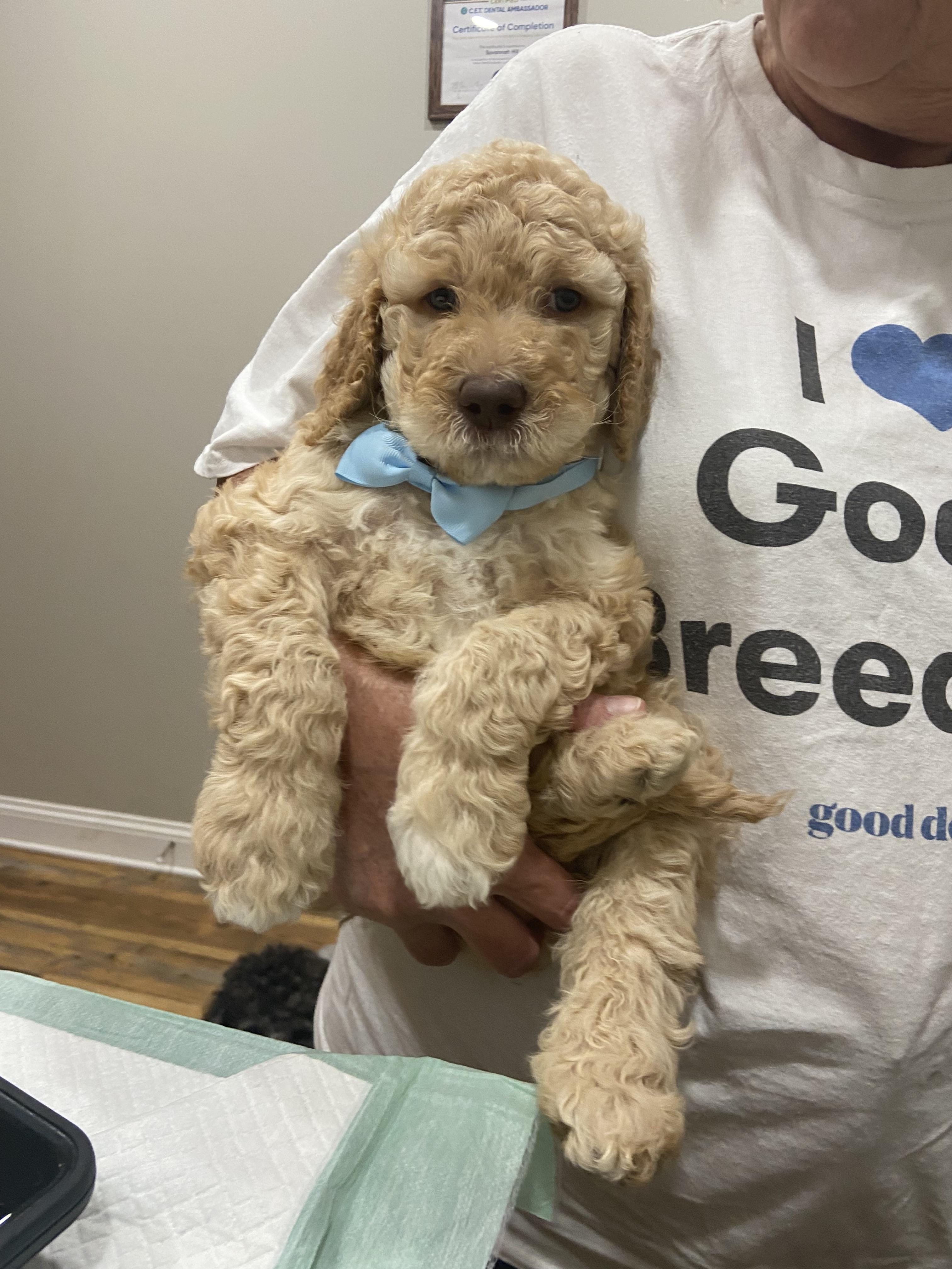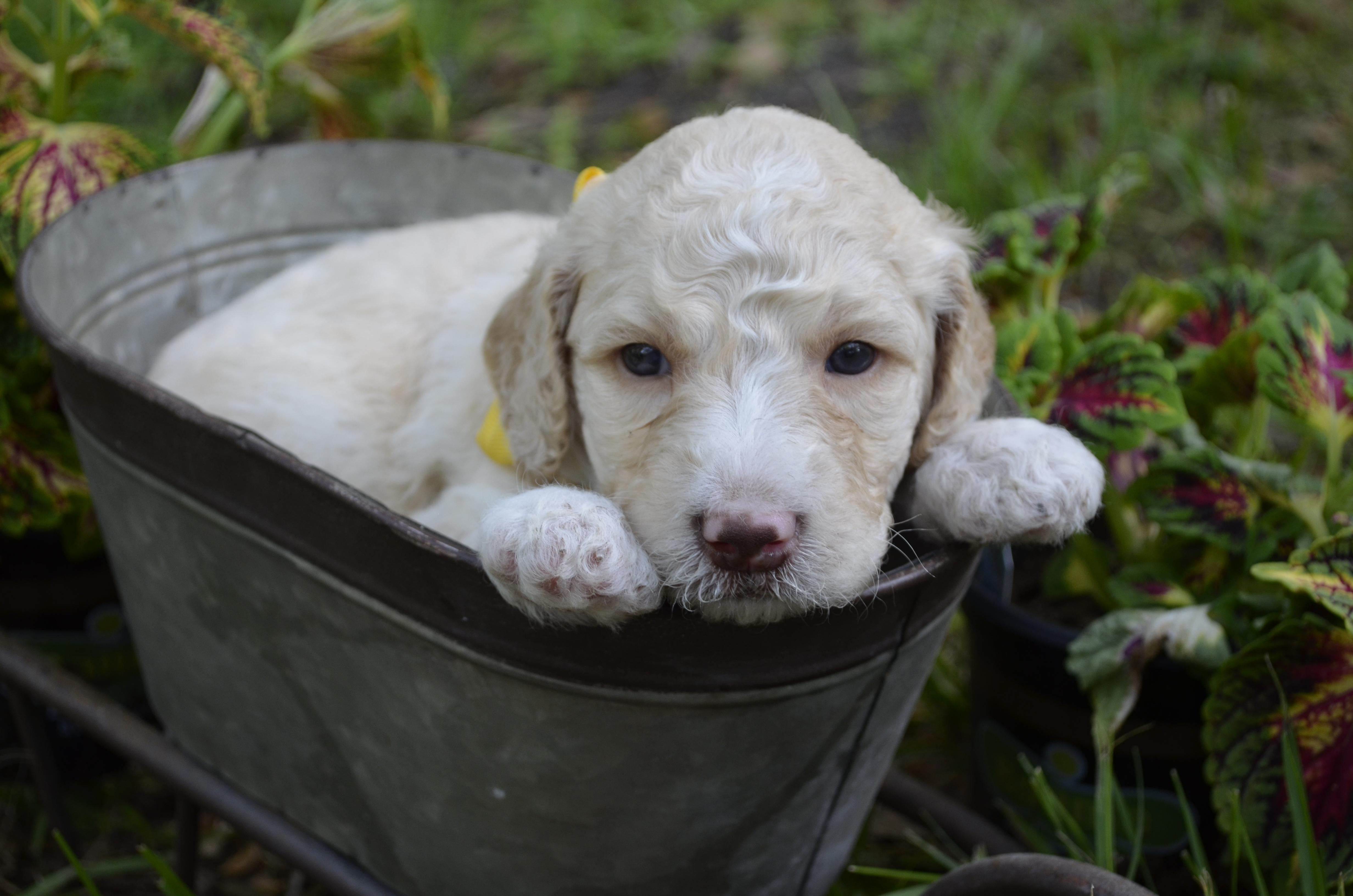 Our Sheepadoodle puppies are fawn and white. Poodle puppies include apricot and parti. Colors will vary depending on the parent dogs.