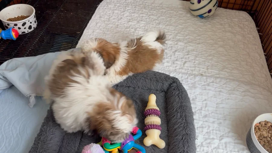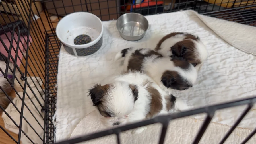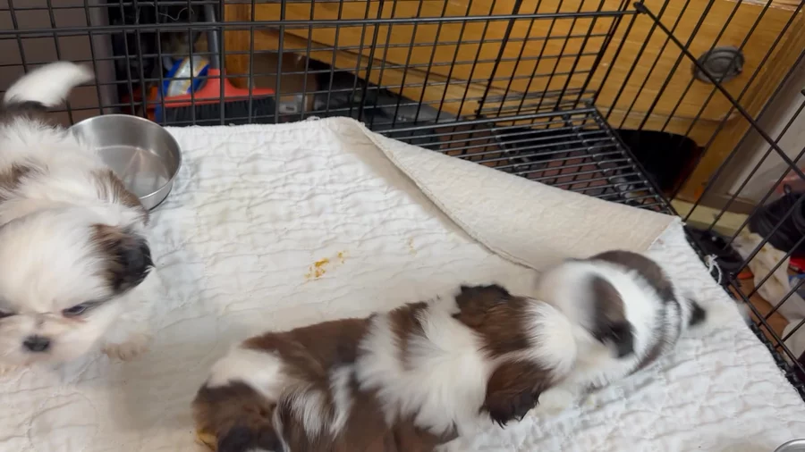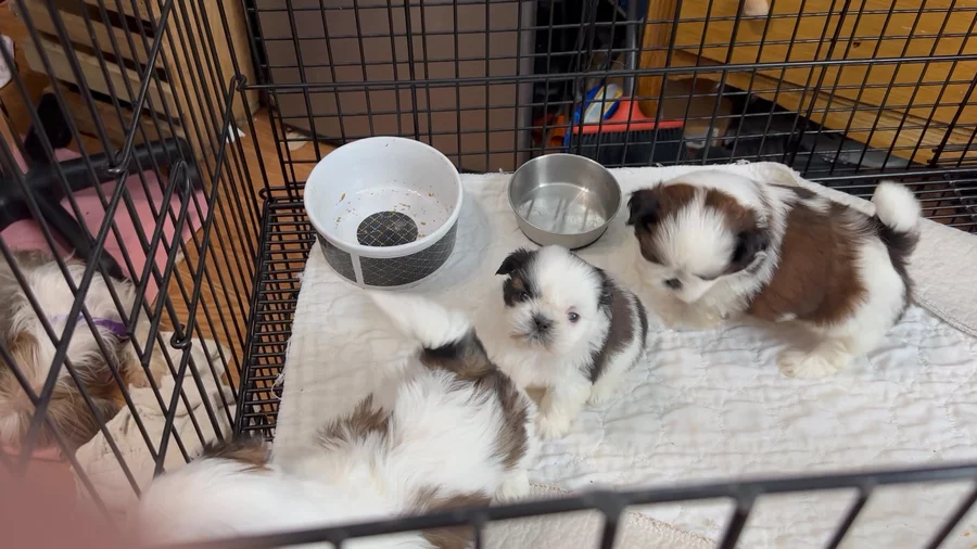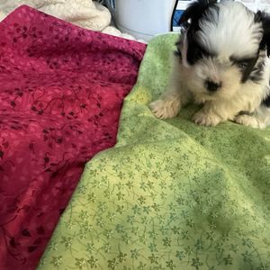 Our Shih Tzu puppies include red and white, gold and white, and black and white. Maltese puppies include white and white and tan. Colors will vary depending on the parent dogs.