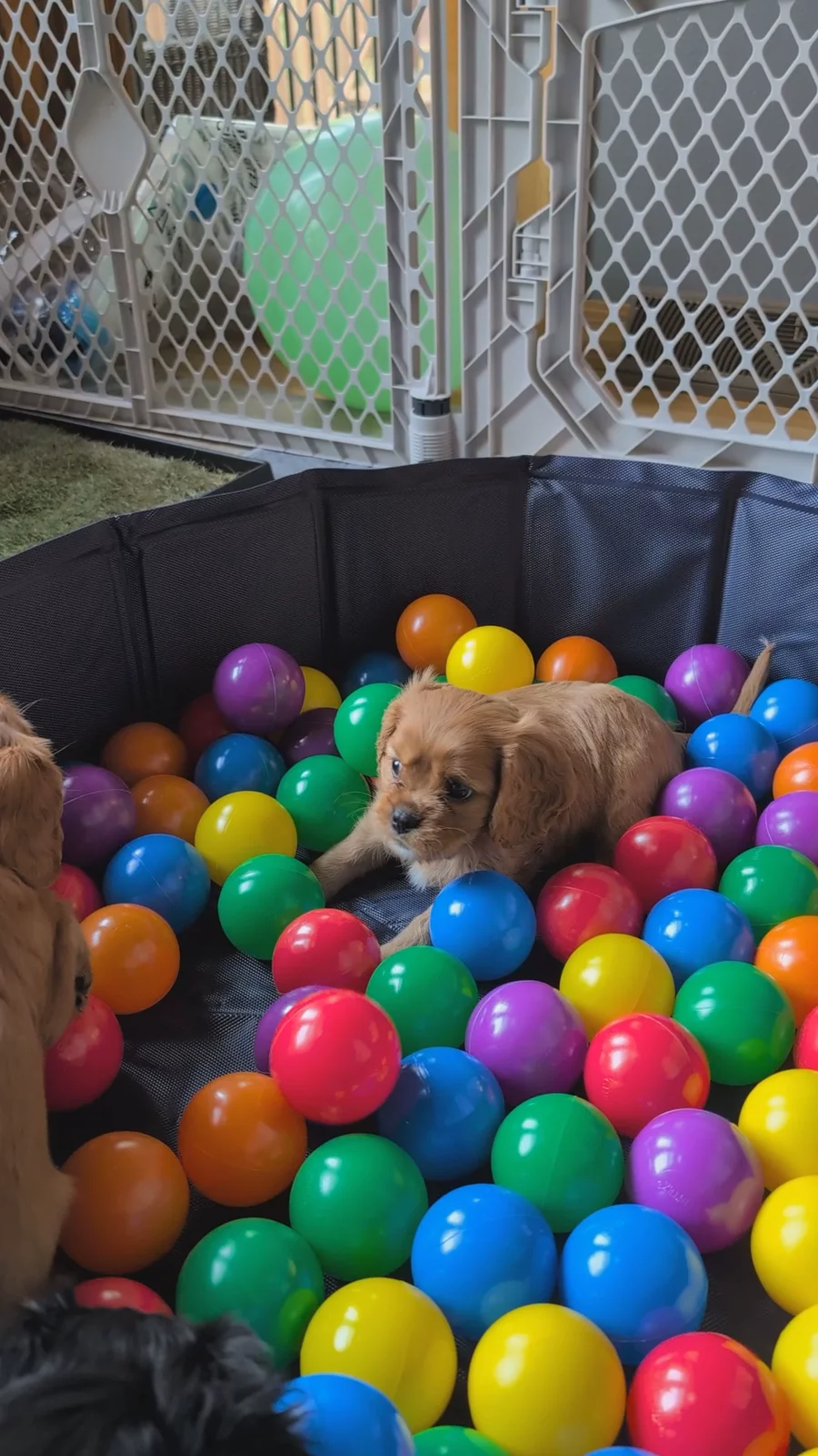 The ball pit is a hit! Puppies are learning not to fear unexpected movement and having fun at the same time.
