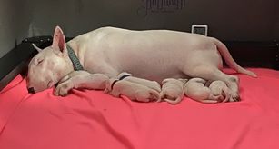 Melissa's grandmother showed St. Bernards for years from when my dad was a kid. Although she mostly had stud dogs, she did have a litter every now and then. It wasn’t until we got our second Bull Terrier, Penelope, that we decided we wanted to get into showing. After getting into the show world and having great mentors, we decided we wanted to have a litter of our own.