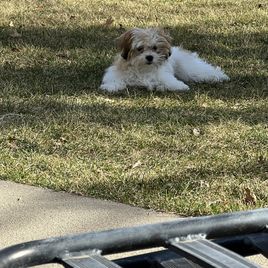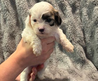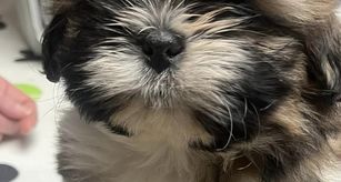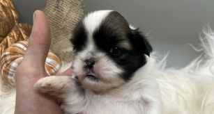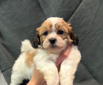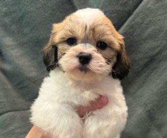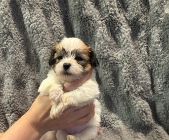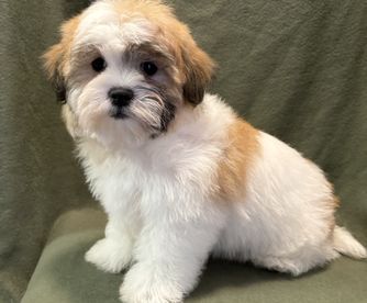 Shichon puppies are brown and white. Colors will vary depending on the parent dogs.