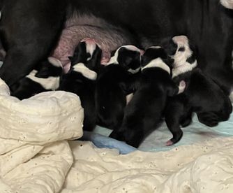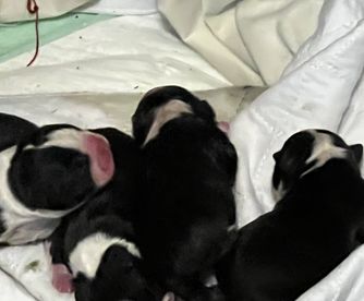 Black and white, Haggarty dot that does transfer to many of her puppies.