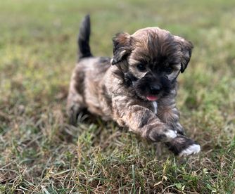 Our Havanese puppies are black and silver. Havapoo puppies include fawn sable, gold sable, silver, silver sable, black and tan brindle, black and silver brindle, and white. Poodle puppies include silver, white, and parti. Colors will vary depending on the parent dogs.