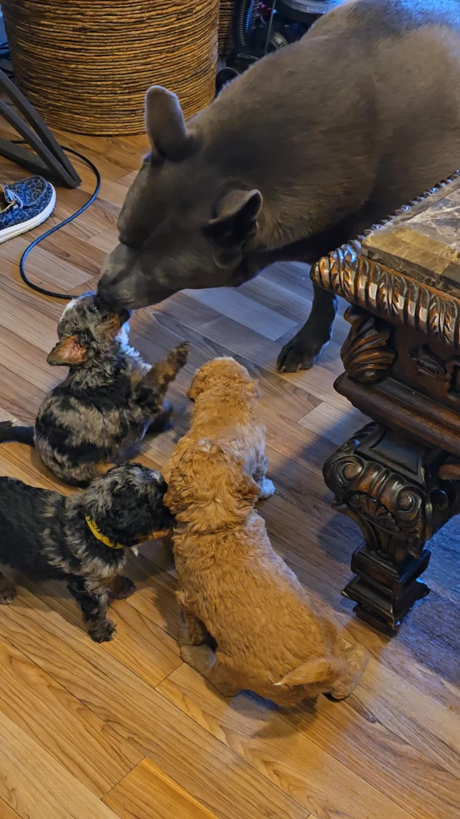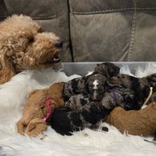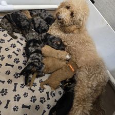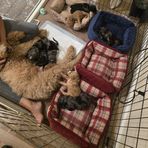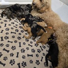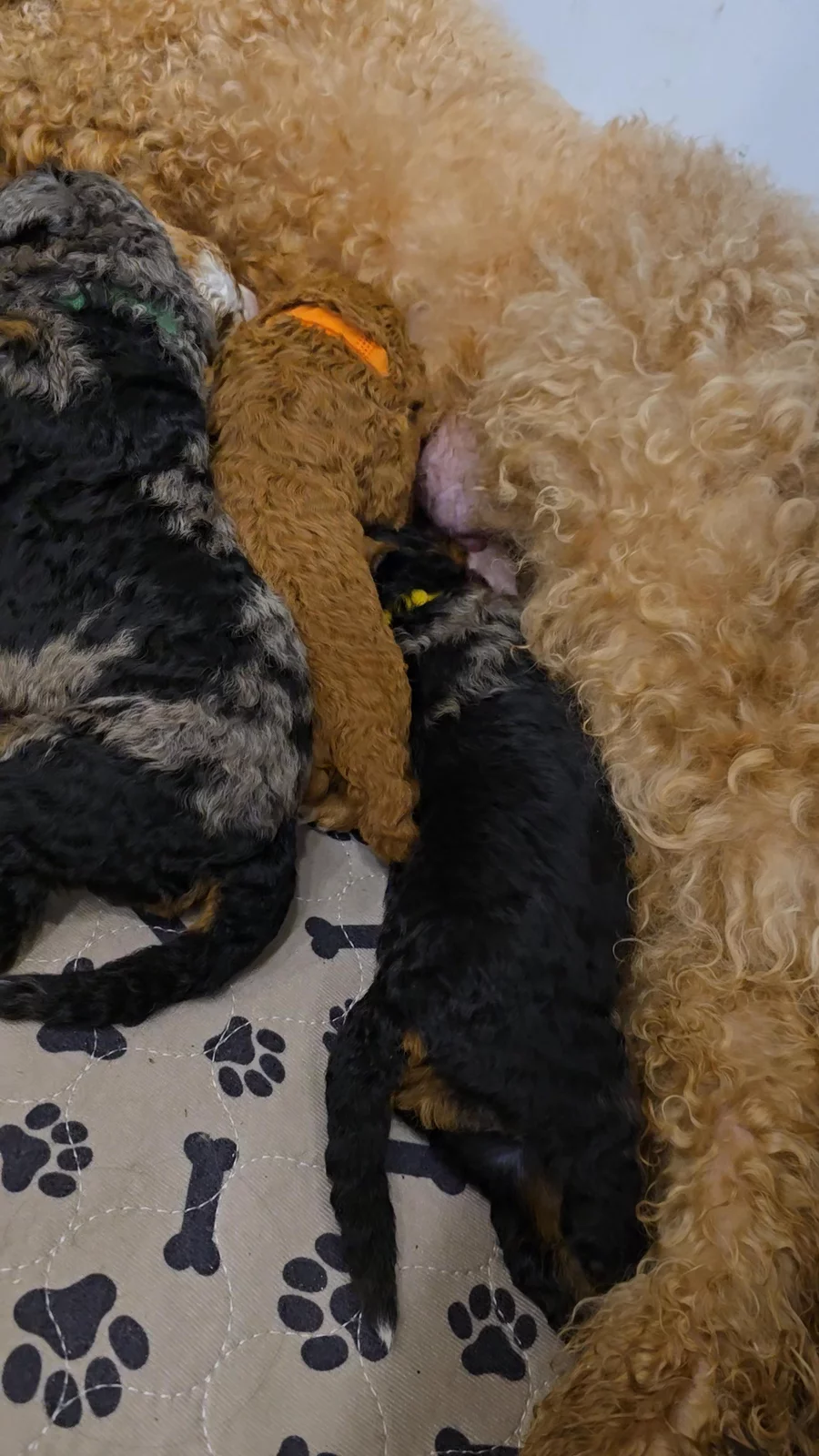 We are super excited to announce our newest members of the family! 🎉🎉 9 healthy babies! 😍 We have 6 Male and 3 female Mini Double Doodles! 🐾🐾 (Mini Aussiedoodle x Mini Bernedoodle)