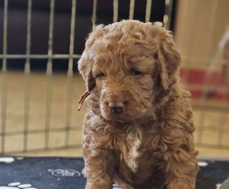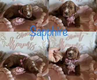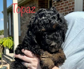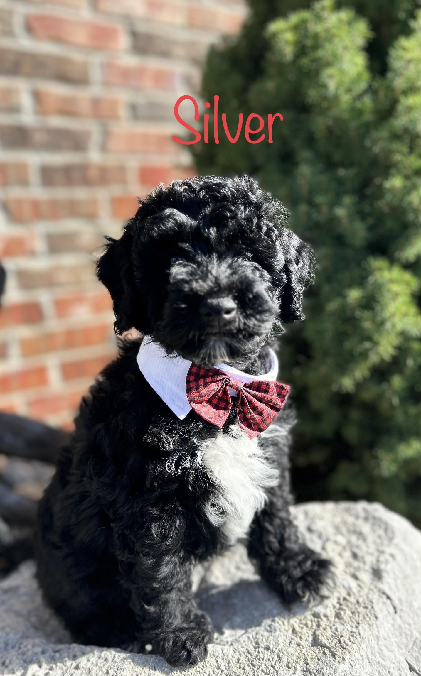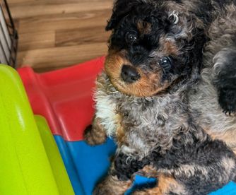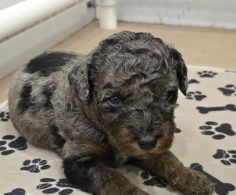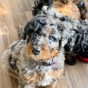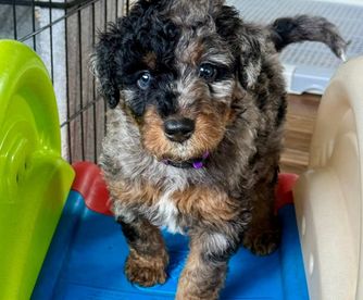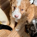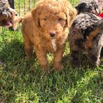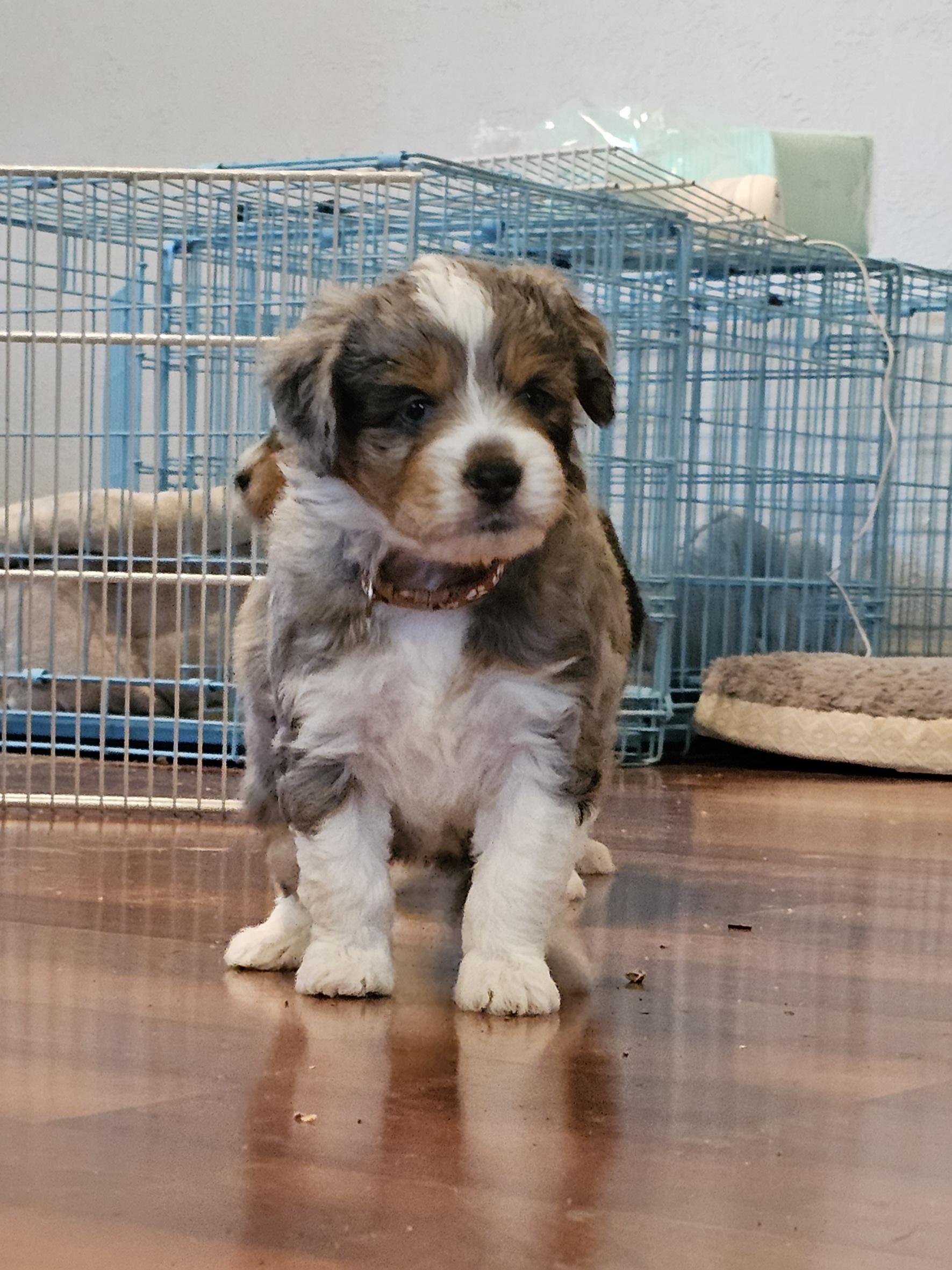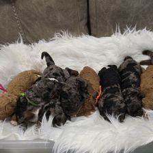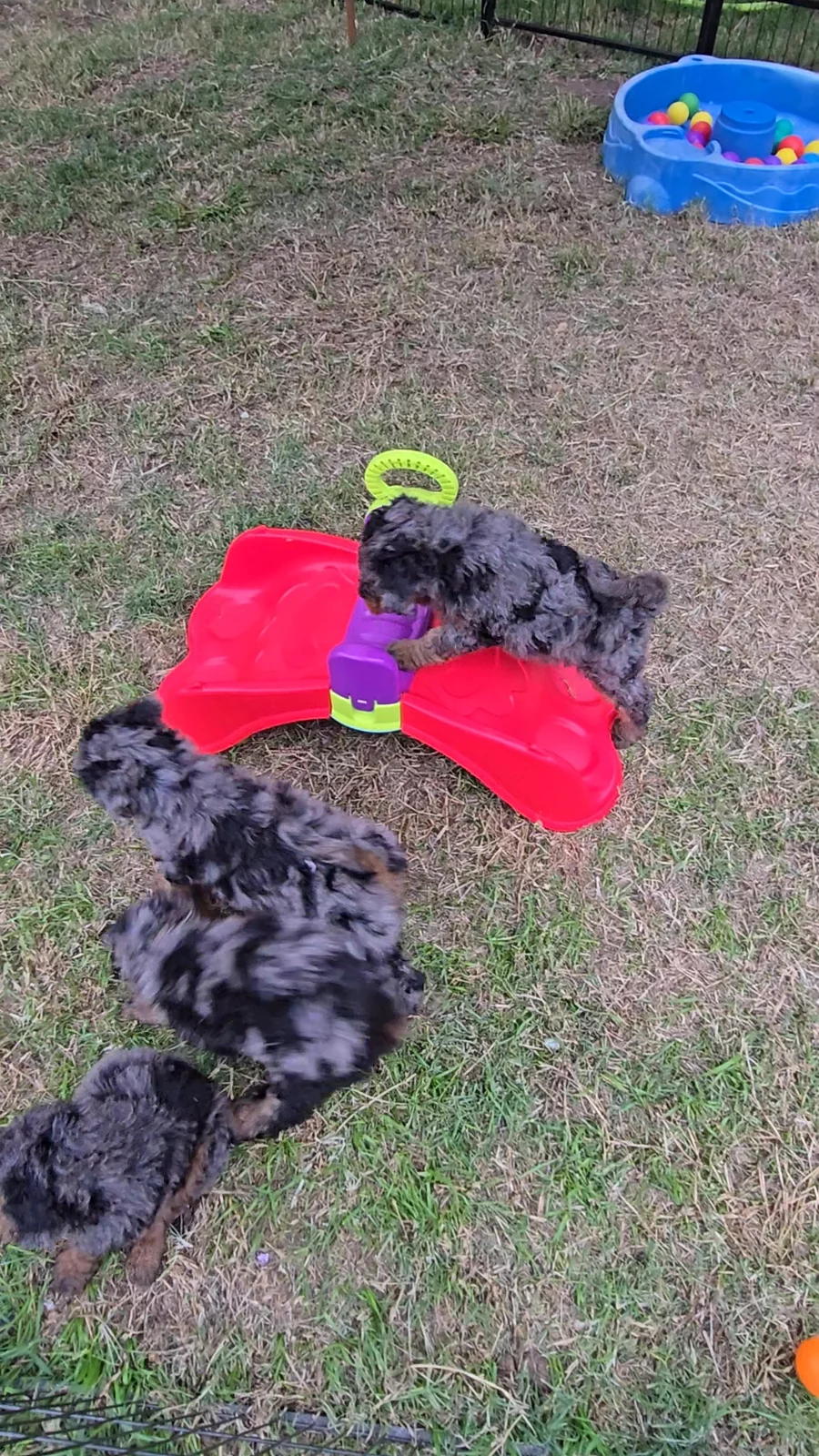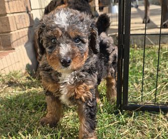 Our Aussiedoodle puppies include brown and white, blue merle, black phantom, black and white, and black tri-color. Double Doodle puppies include merle, cream, red, and apricot. Colors will vary depending on the parent dogs.