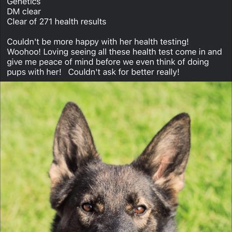 Parsons German Shepherds reports to performing the health tests below on their breeding dogs. Ask your breeder about the tests performed on the parents of your litter. Learn more about health testing for German Shepherds.