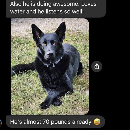 Alisa was great! She communicated with pupdates and answered any questions I had. She had already started crate training when we got our girl at 8 weeks. She (Ziva) did great the first night to our home. Good dog made it super easy to search with criteria and also with payments. We are so happy we chose Parsons German Shepherds for our new little girl. Thank you Alisa 🥰