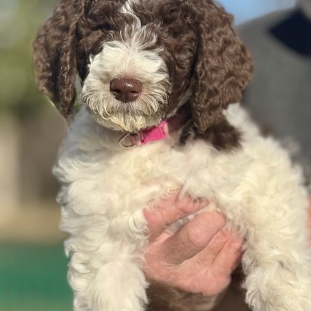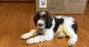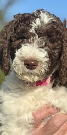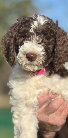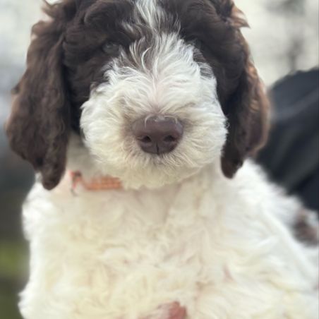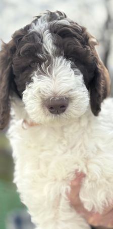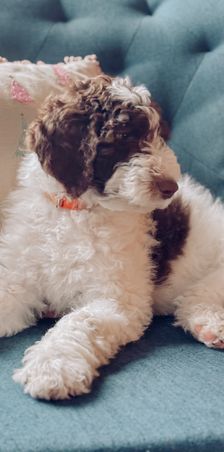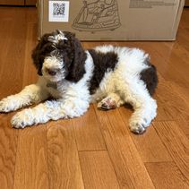 She is 8 weeks old, a stunning parti brown and white AKC registered Standard Poodle. 💕
