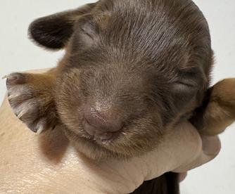 Thursday is a beautiful long haired chocolate dapple miniature dachshund that was born in my kennel from my dogs. She has a sweet and playful personality and is always curious what is happening around her. She is a great mom and does a great job raising her puppies.