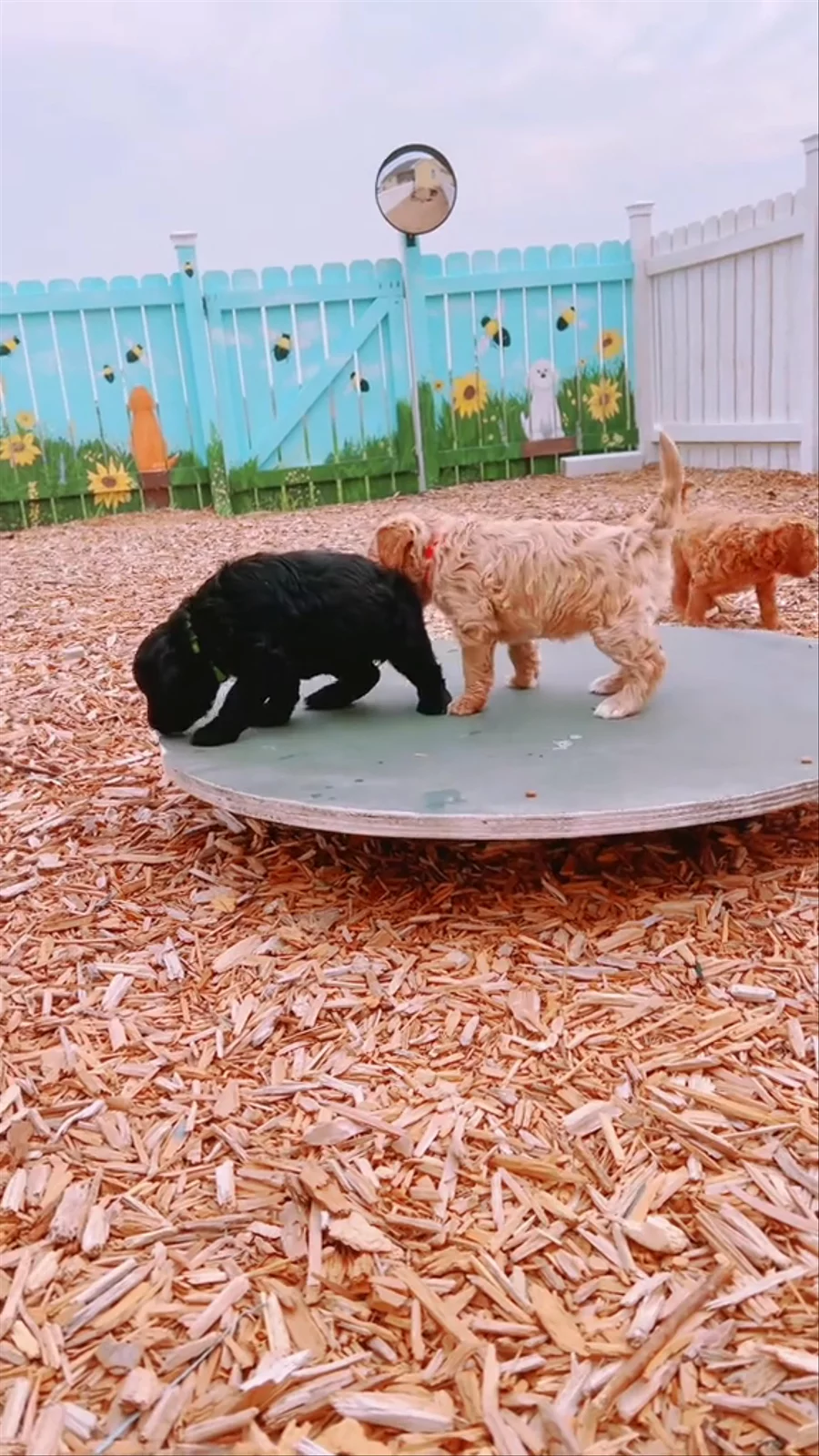 Puppies are mastering the wobble board. This helps to prevent car sickness and builds confidence.