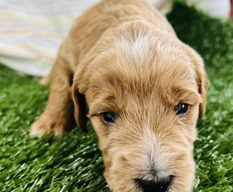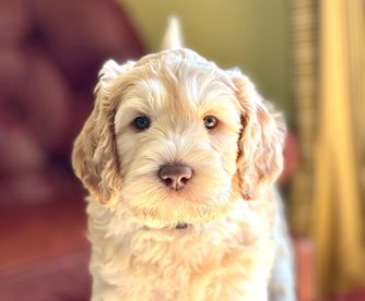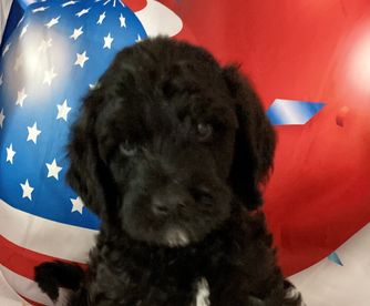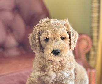 Butters is a giant lap dog who loves to please. He has a larger bone structure, a buttery color, and a wonderful disposition. He has a non-shedding, fleece coat with big loose curls. He loves to train and can perform several service tasks on command. One of his puppies is currently a therapy dog.