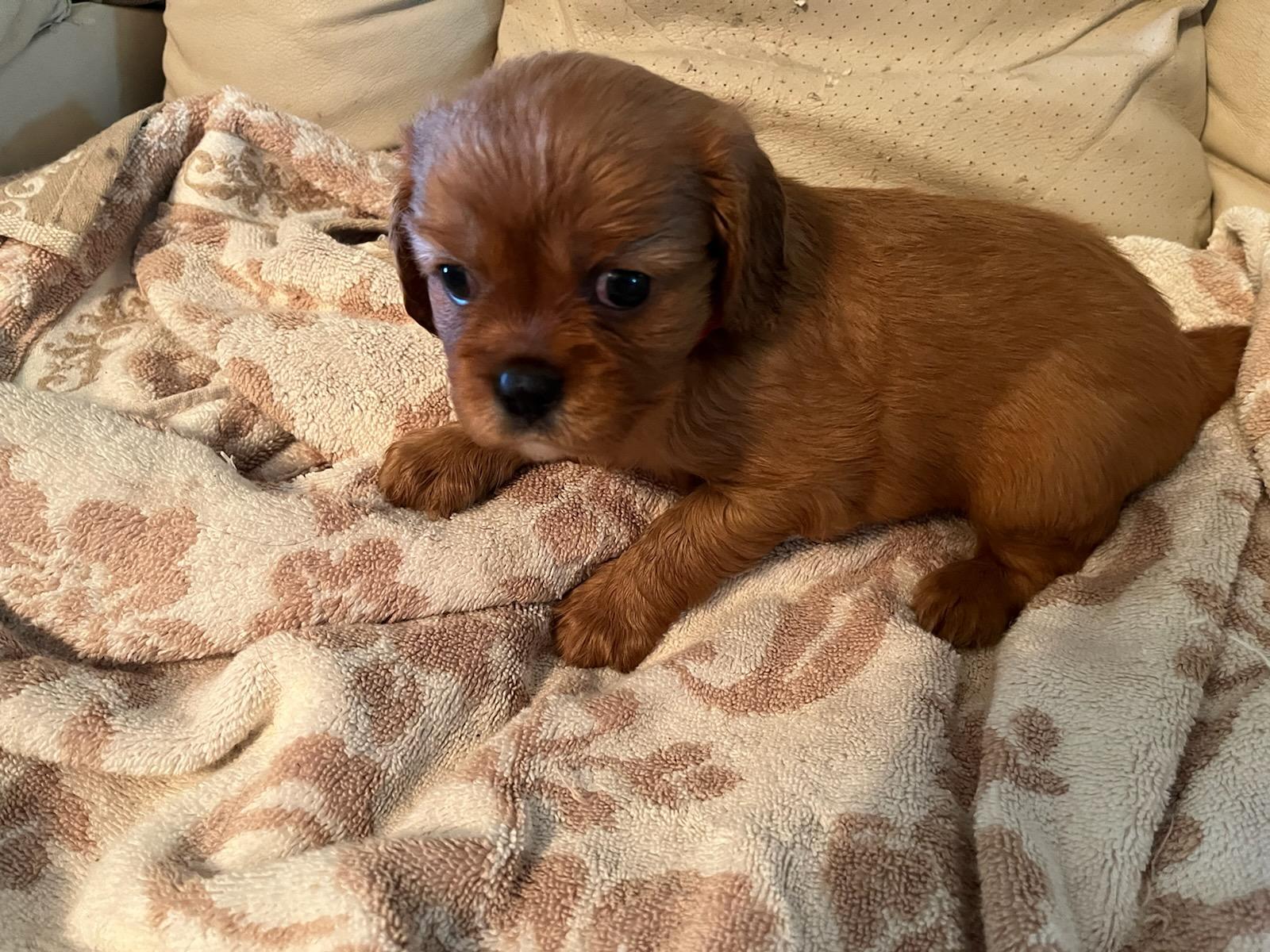 Our Cavapoo puppies are red. Cavalier King Charles Spaniel puppies include blenheim, ruby, tri-color, and black and tan. Colors will vary depending on the parent dogs.