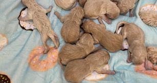 Our Goldendoodle puppies include cream, apricot, and red. Colors will vary depending on the parent dogs.