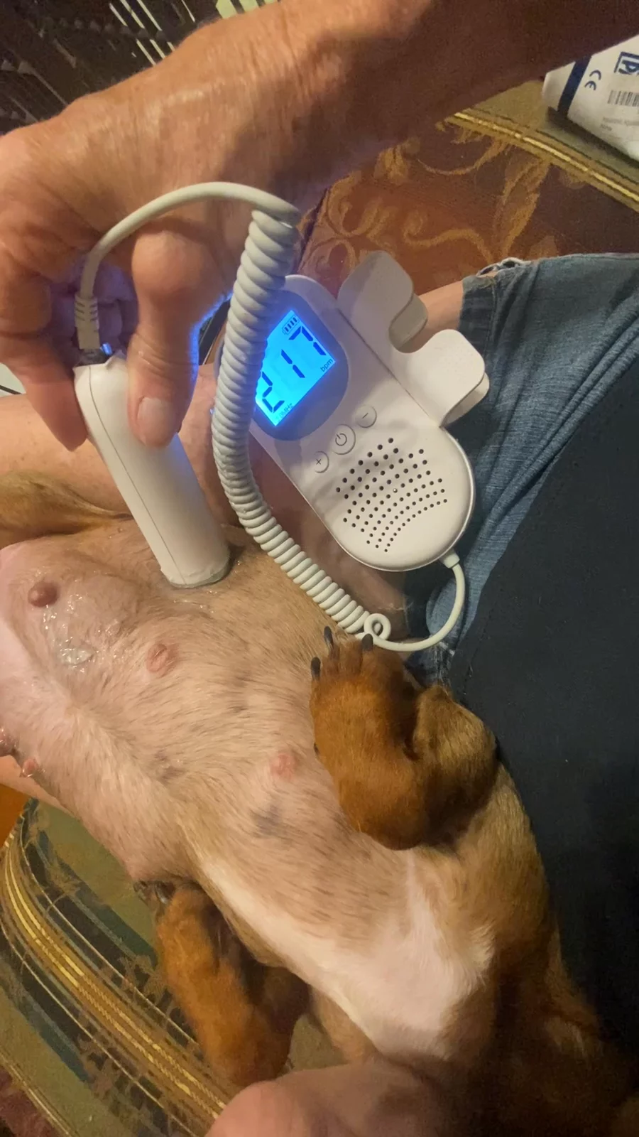 Sage is due around July 15, 2025. Something I love to do is listen to those tiny heartbeats! I’ve been listening to them for the past few weeks. It “sounds” like she’ll be having 3. Soon we’ll know for sure! 🥰 (If you watch closely at the end once I take the Doppler away, you’ll see the puppies moving.)