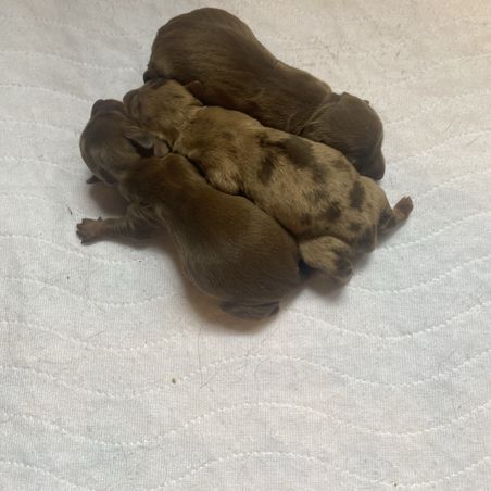 Sage delivered her 3 puppies early this morning (7/15/25). Chocolate & tan male, chocolate & tan female and chocolate & tan dapple female 💙🩷🩷.