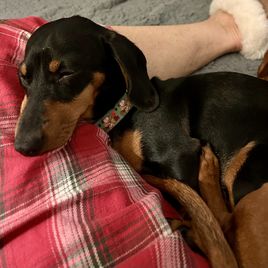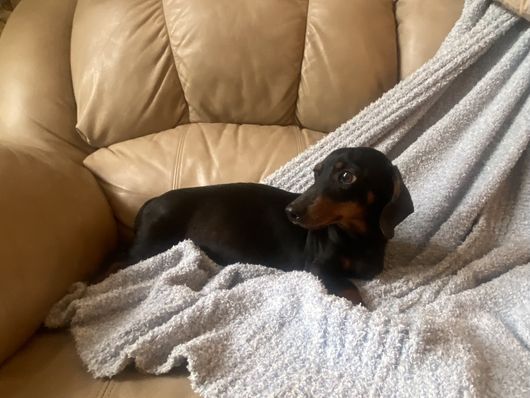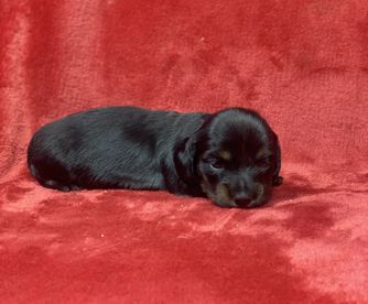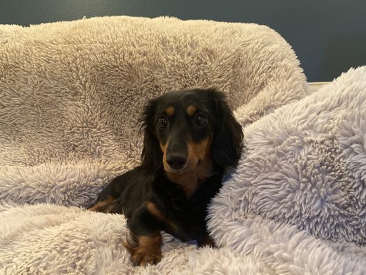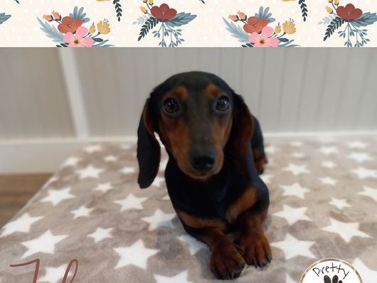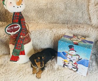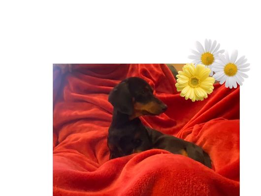 Daisy is a CKC registered black and tan smooth hair miniature dachshund. She’s laid back and has an easy going temperament.