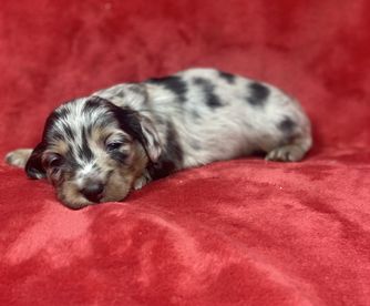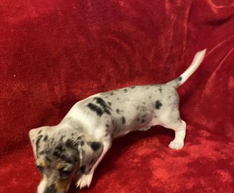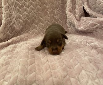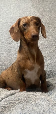 Sage is a chocolate and tan dapple, smooth hair CKC registered miniature Dachshund. She is super sweet and gets along well with other dogs of all sizes and is people friendly. She has an easy going demeanor.