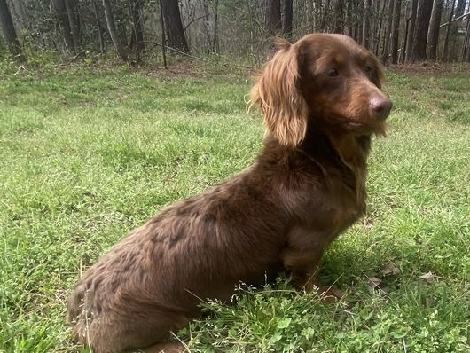 Ginger is an AKC & CKC registered longhair, chocolate and tan miniature dachshund. She is a sweet natured girl that enjoys playing with people and other dogs.