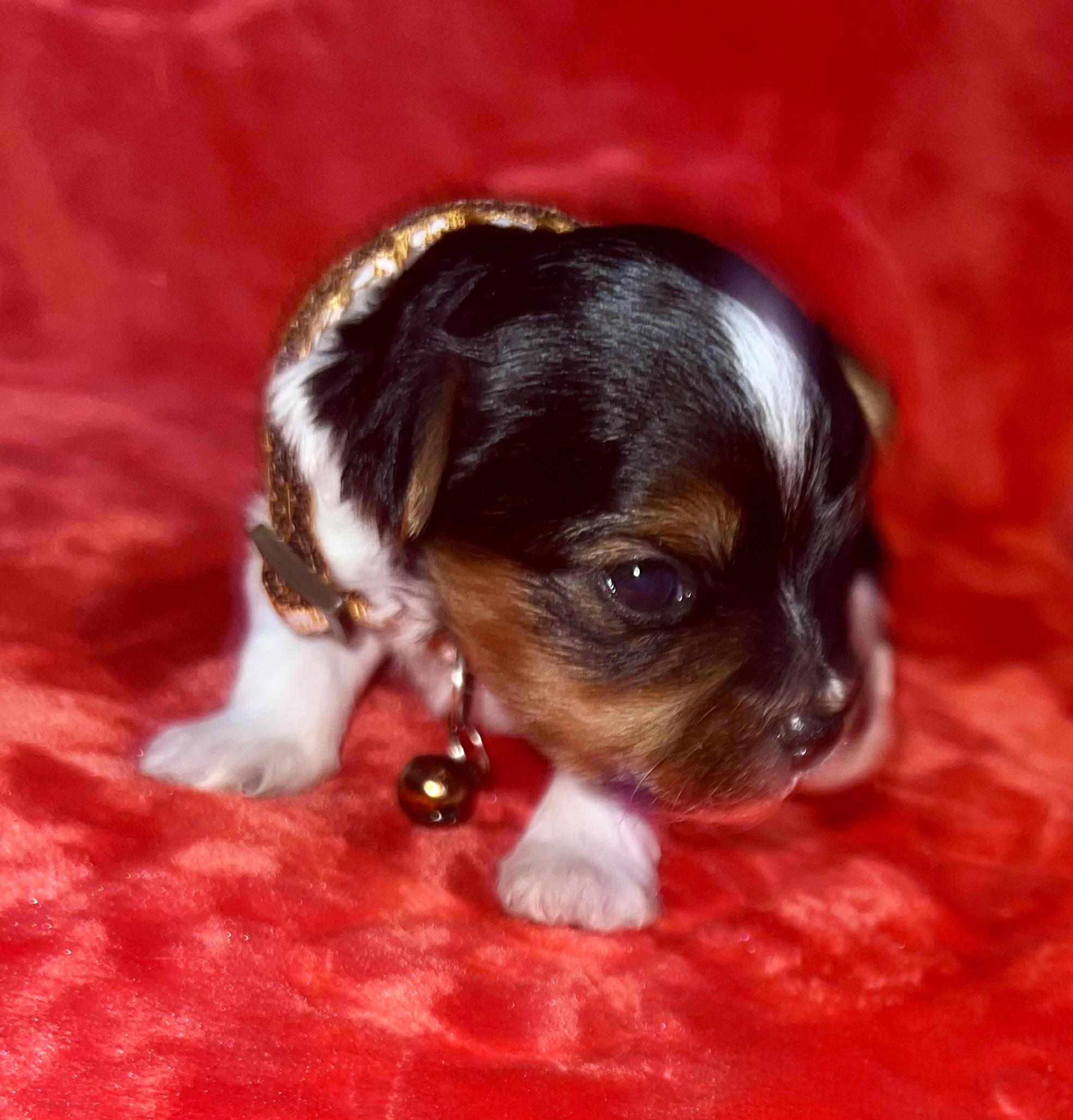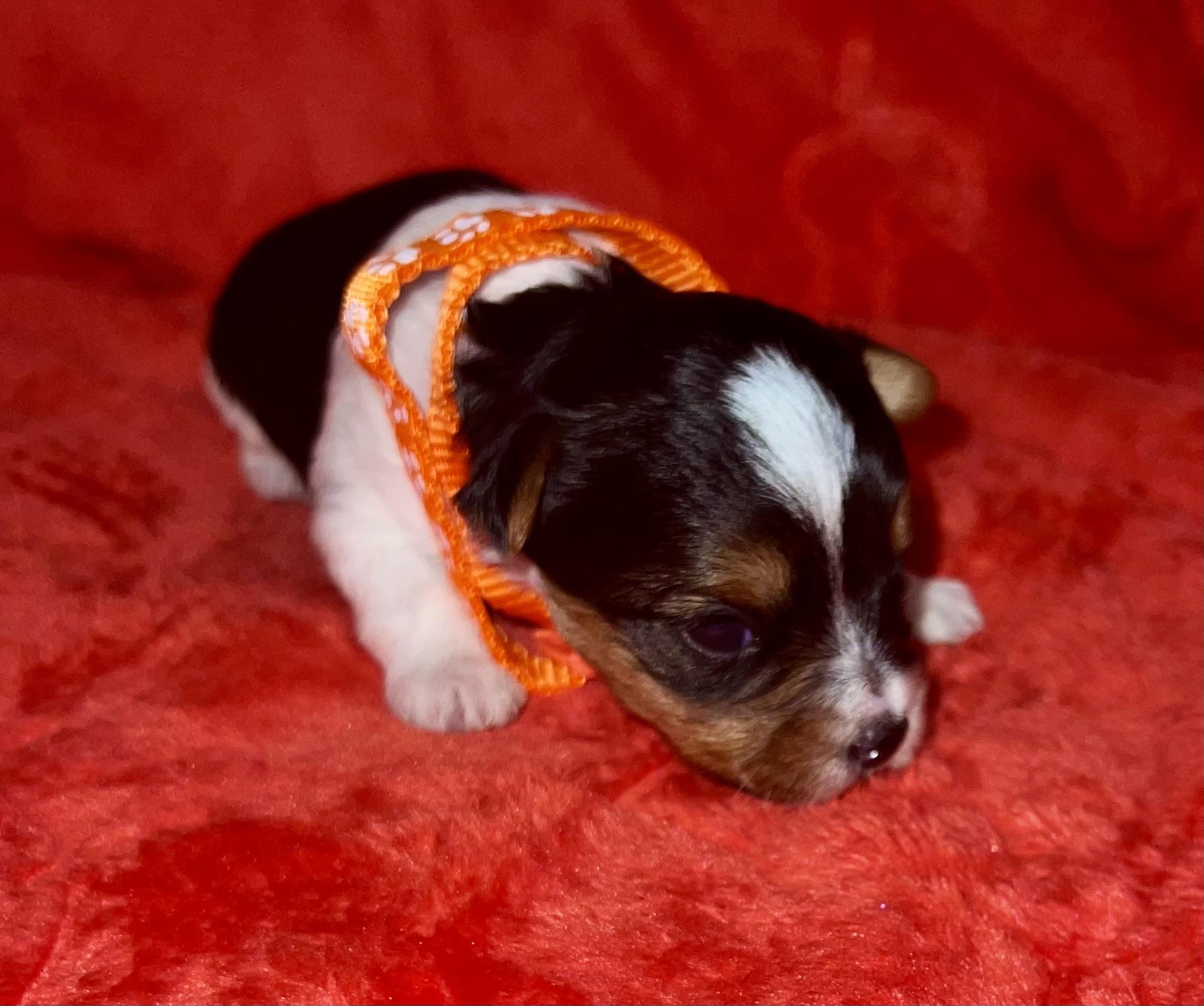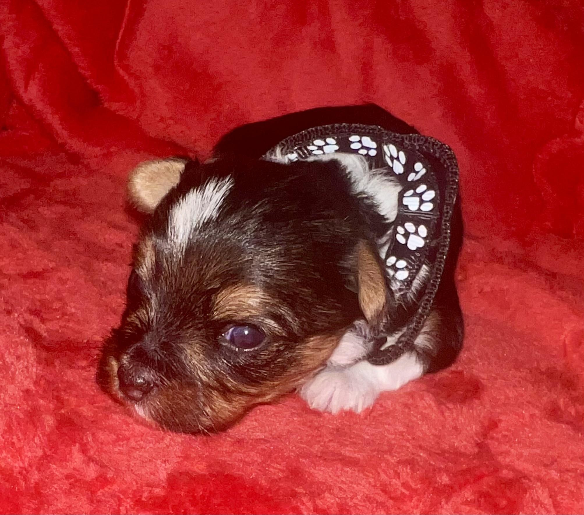 Snickers is a full blooded Yorkshire parti that is CKC registered.