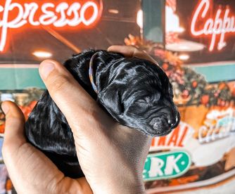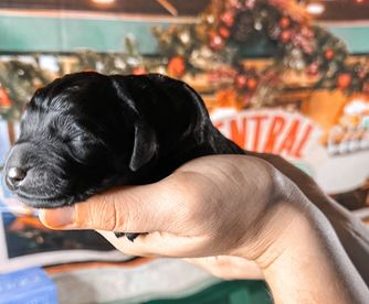 Our Golden Retriever puppies include dark golden, golden, and light golden. Goldendoodle puppies are black. Colors will vary depending on the parent dogs.
