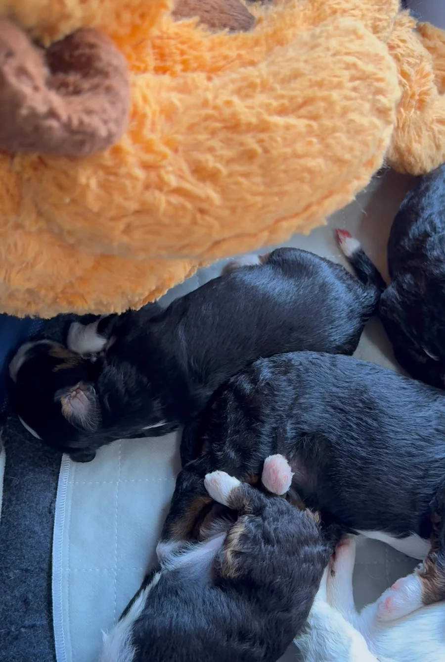 Snoozing to Thunder. 🤗 Rosie-Mac’s Lunar Litter of Mini Bernedoodles are nearly 2 weeks old & doing wonderful.