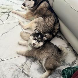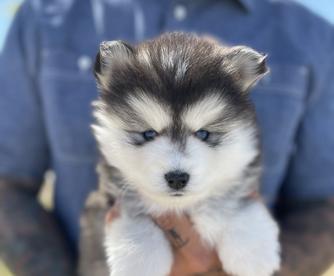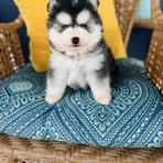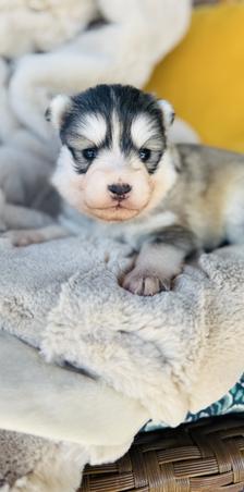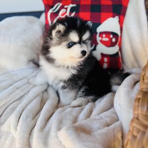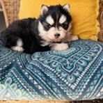 Daisy is a beautiful silver mini Pomsky ! She is 17 pounds , with a sweet calm demeanor!