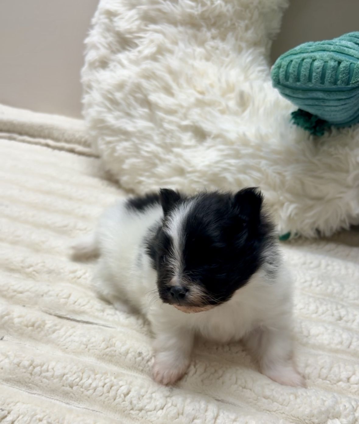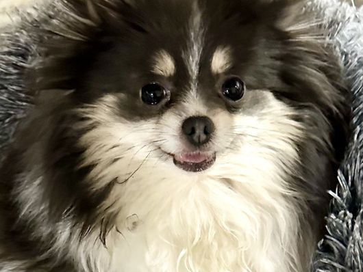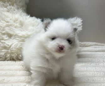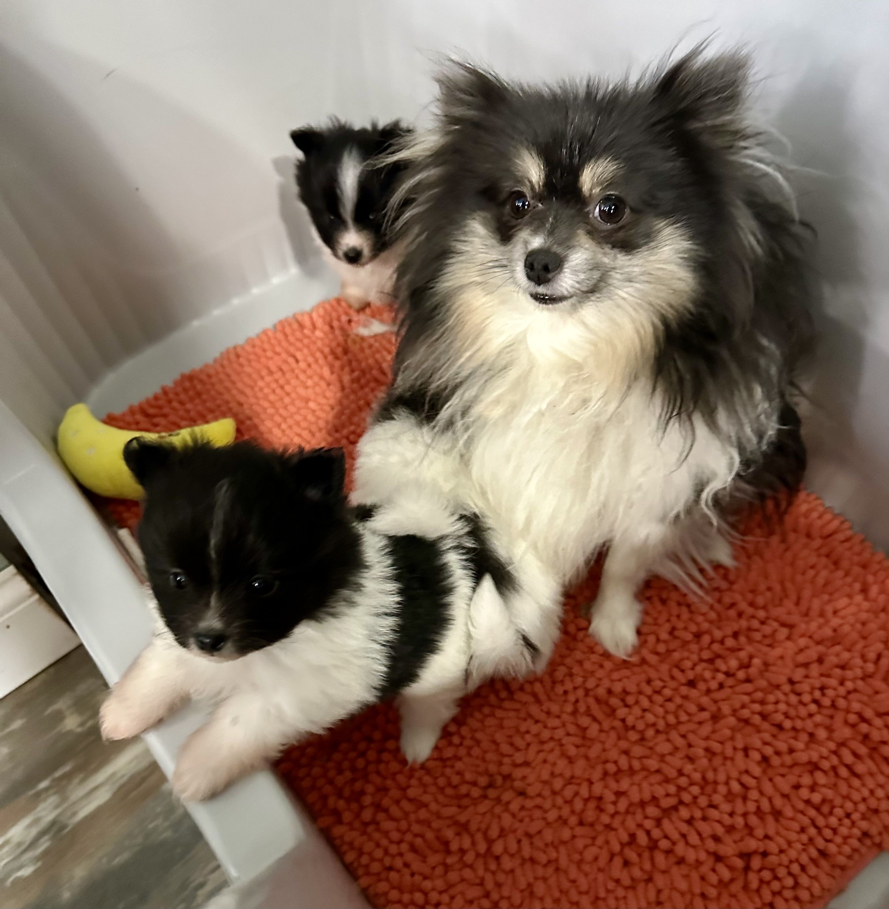 AKC Tinsel is a Blue and White Parti pom with Tan markings. She has a compact, sturdy little body and a very cute face! She is a very sweet and affectionate Pomeranian and loves to carry her toys around and hides them in her bed! She is a very attentive mother and is always cleaning and looking after her pups. Tinsel likes to be in your lap and playing fetch! She has a lot of Chocolate and Blue coloring in her pedigree and her babies are just gorgeous!
