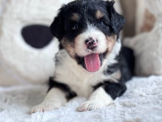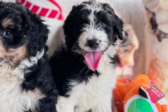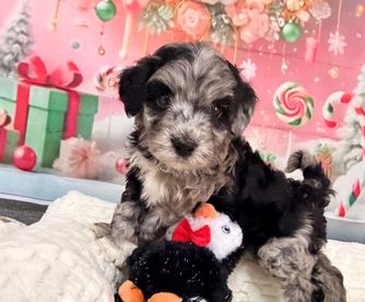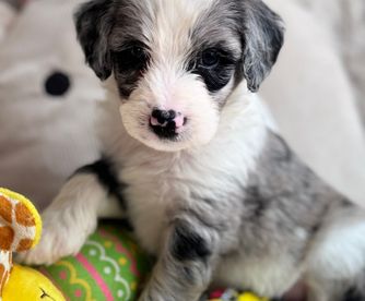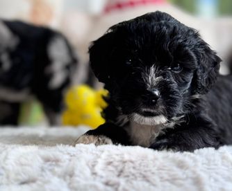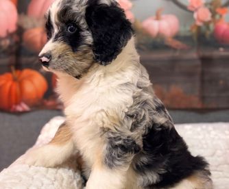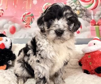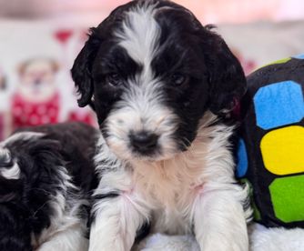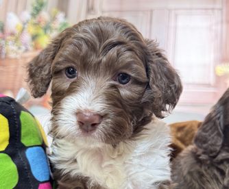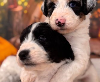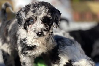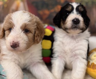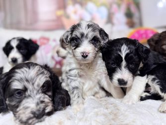 Our Cavapoo puppies include merle, cream, red, and chocolate. Aussiedoodle puppies include apricot, sable, blue merle, red merle, black and white, and black tri-color. Colors will vary depending on the parent dogs.