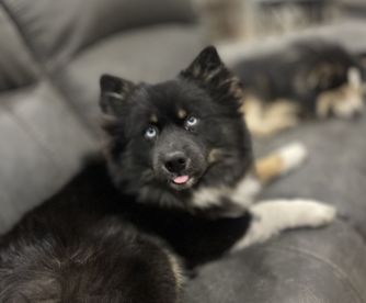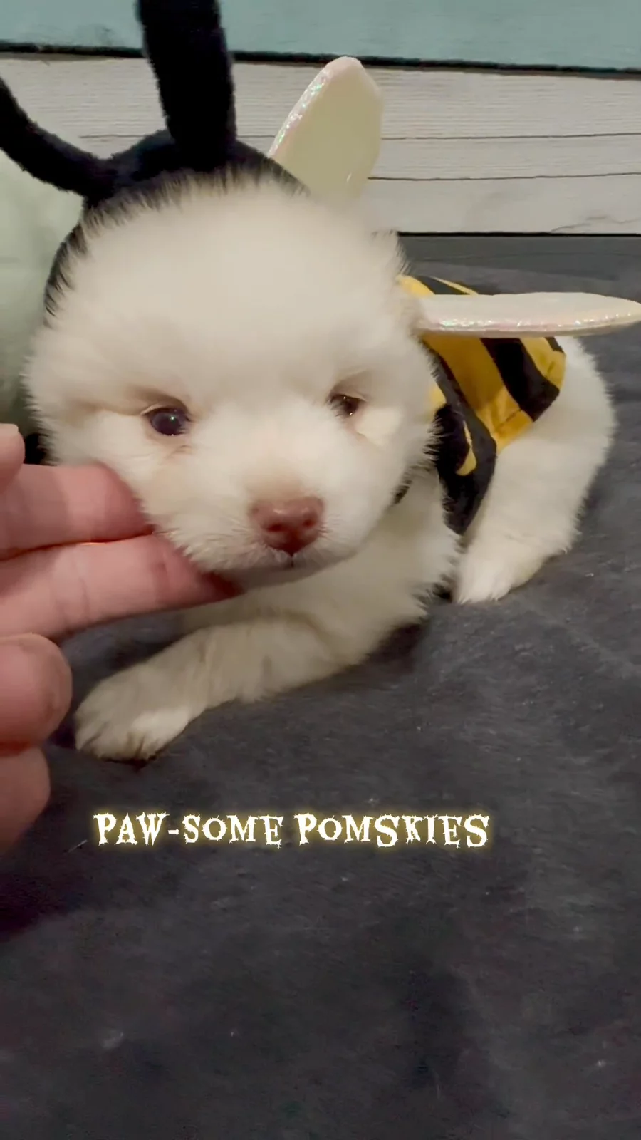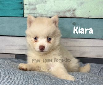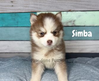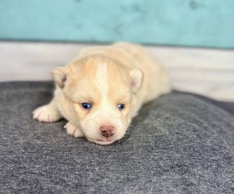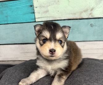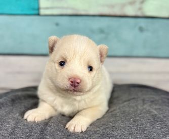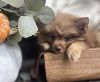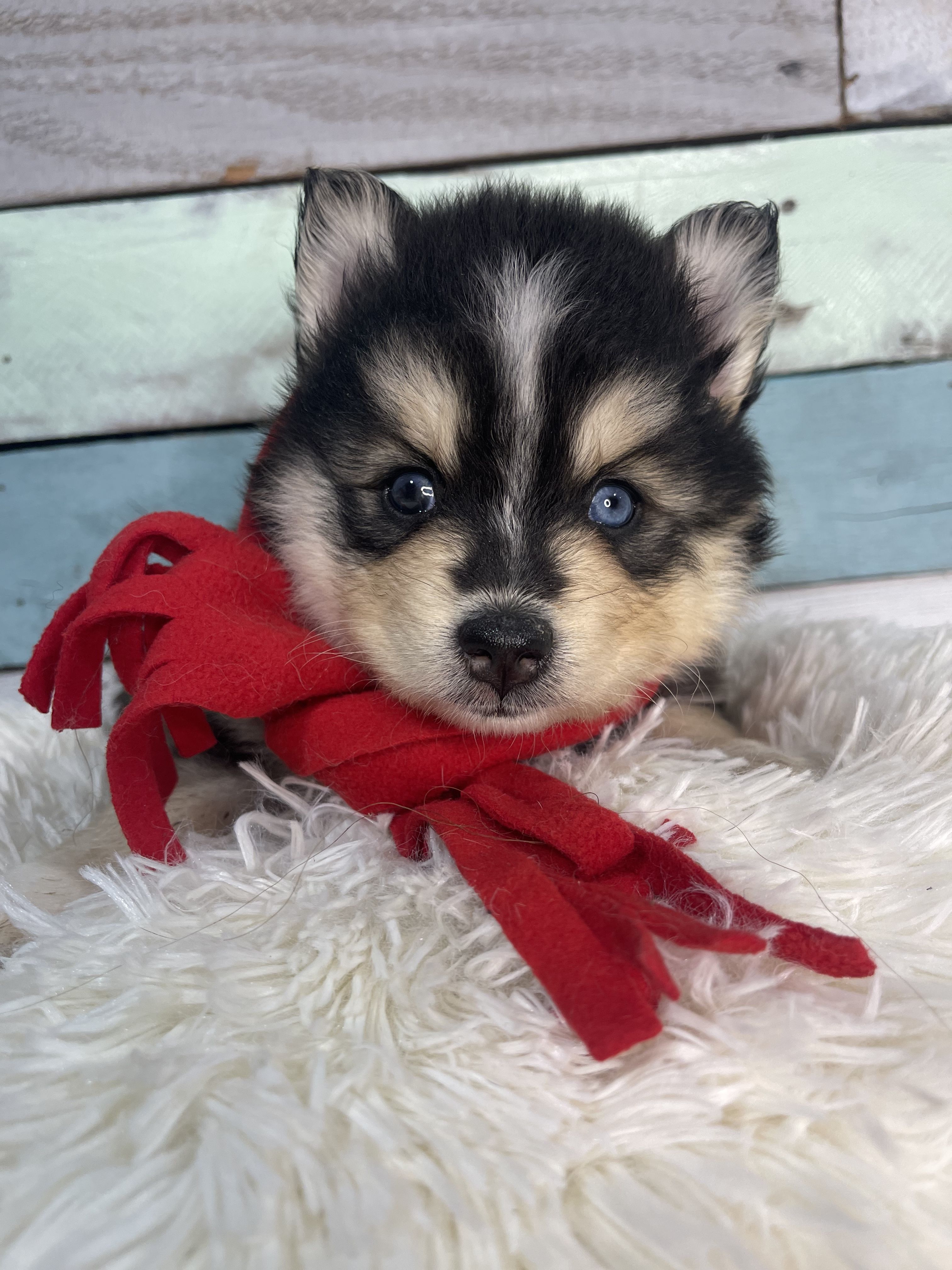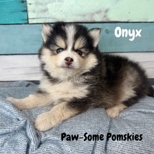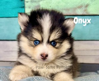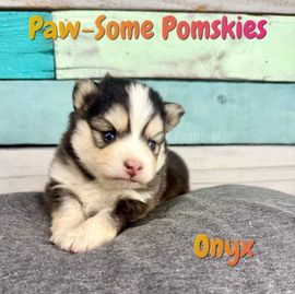 Our Pomsky puppies include white, black, black and white, chocolate, merle, and red and white. Pomeranian puppies include black parti, cream, white, chocolate, orange sable, blue merle, black and tan, and black and brindle. Colors will vary depending on the parent dogs.