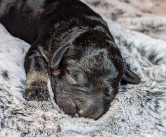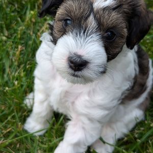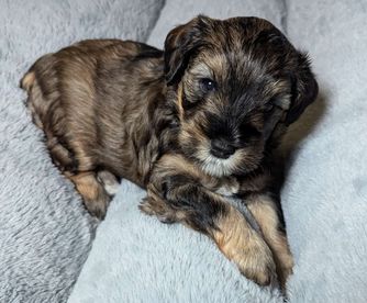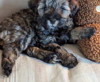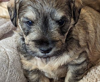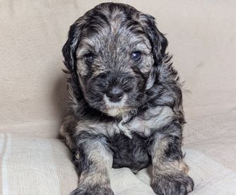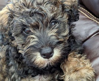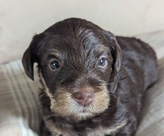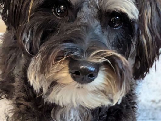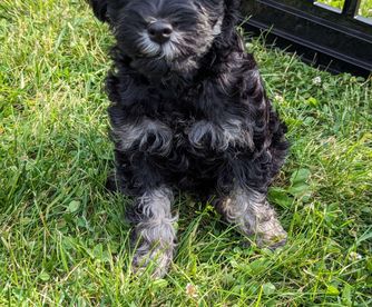 Charlie is an F1 Mini Schnoodle. Charlie's hair is mostly black, with a silver belly and legs. He has white on his beard, chest and eyebrows. A small amount of tan highlights on his ears.