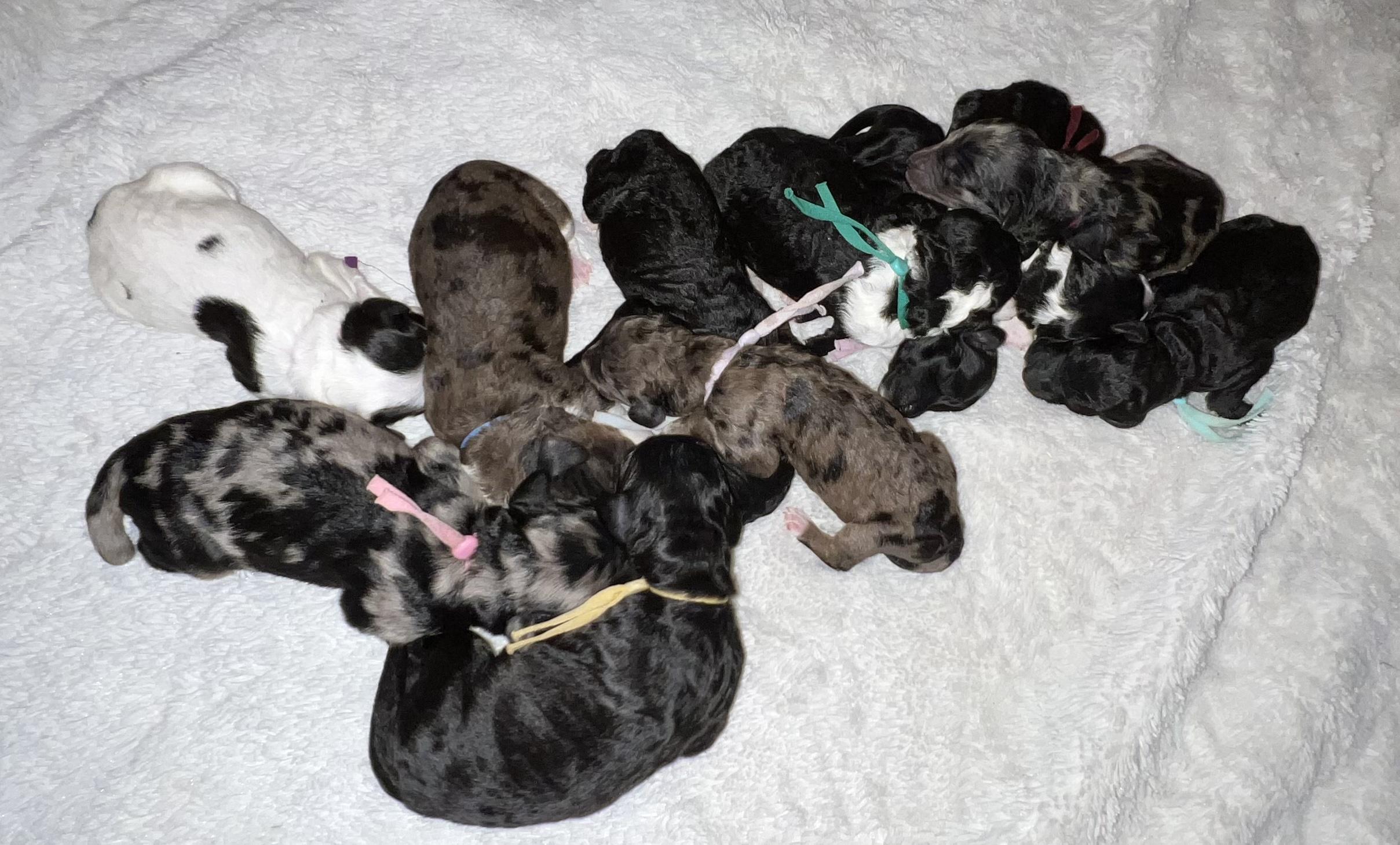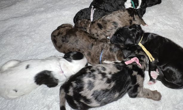 Our puppies include black, merle, and parti. Colors will vary depending on the parent dogs.