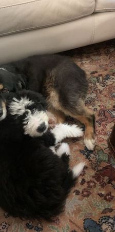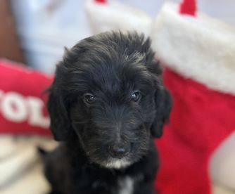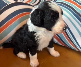 Our Bordoodle puppies include white and black, red, and black. Colors will vary depending on the parent dogs.