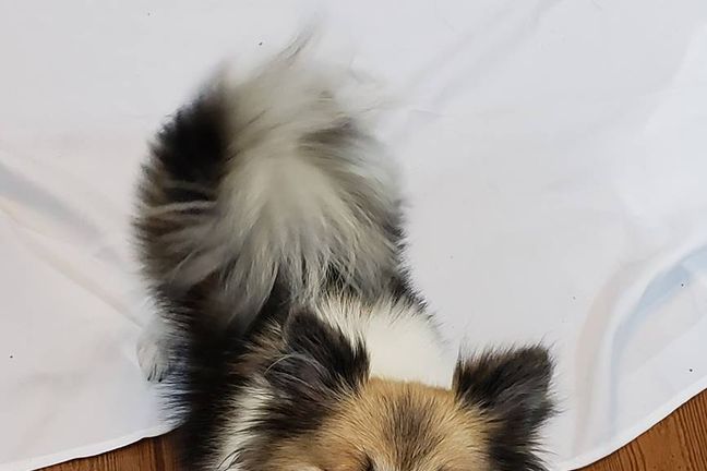 Ocean has an Orange coat with Lavender Sable and Merle patterning. He has one blue eye and one green eye and a gorgeous coat. He's a super happy and sweet boy who likes to tell us all about whatever is on his mind.