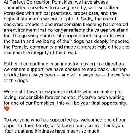 Perfect Companion Pomskies meets or exceeds our community standards in these areas:
