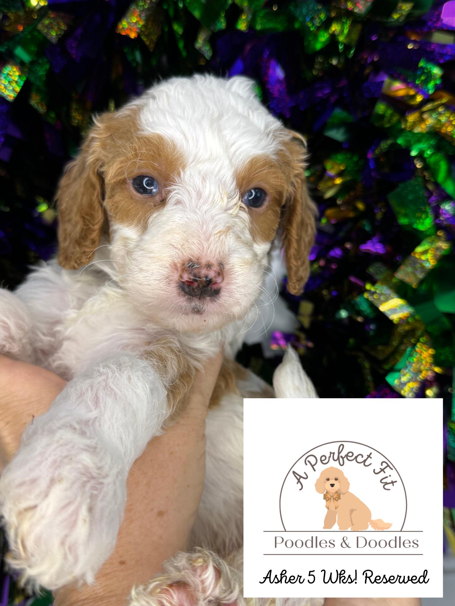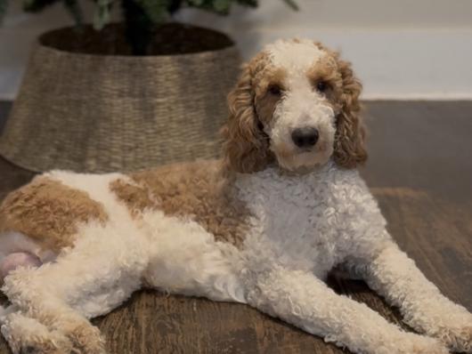 Introducing Atlas, a striking 40 lb Parti Golden Doodle with a charming personality and an impressive pedigree. Atlas features a beautiful coat of soft, wavy fur that showcases a delightful mix of white and creamy brown patches, making him not only a fantastic companion but also a visually stunning stud.