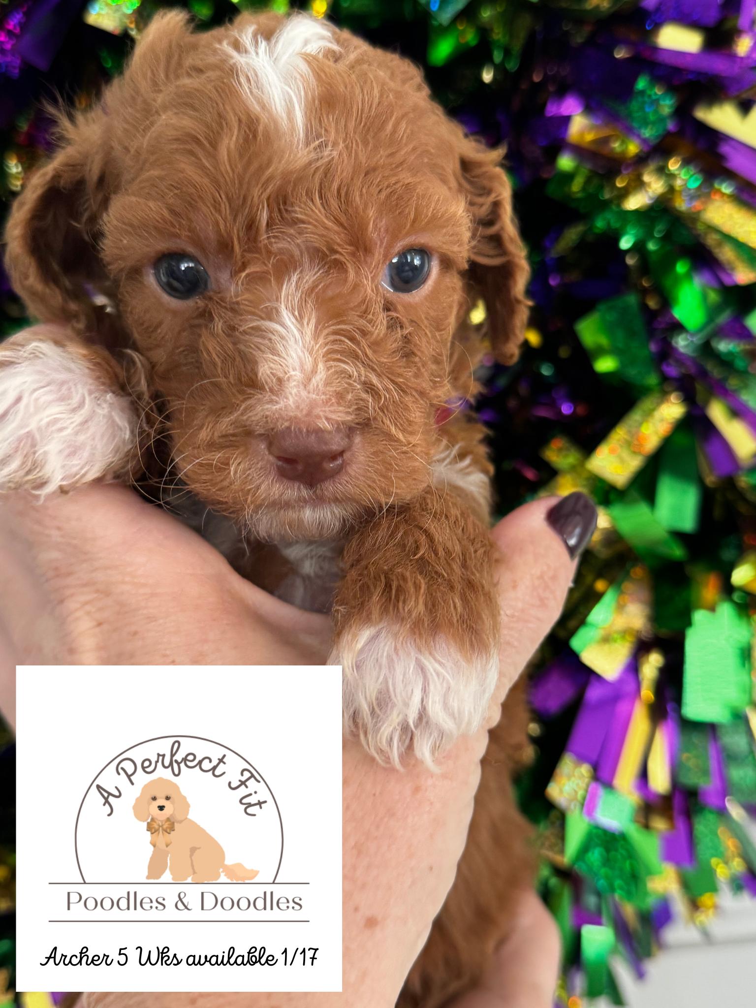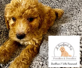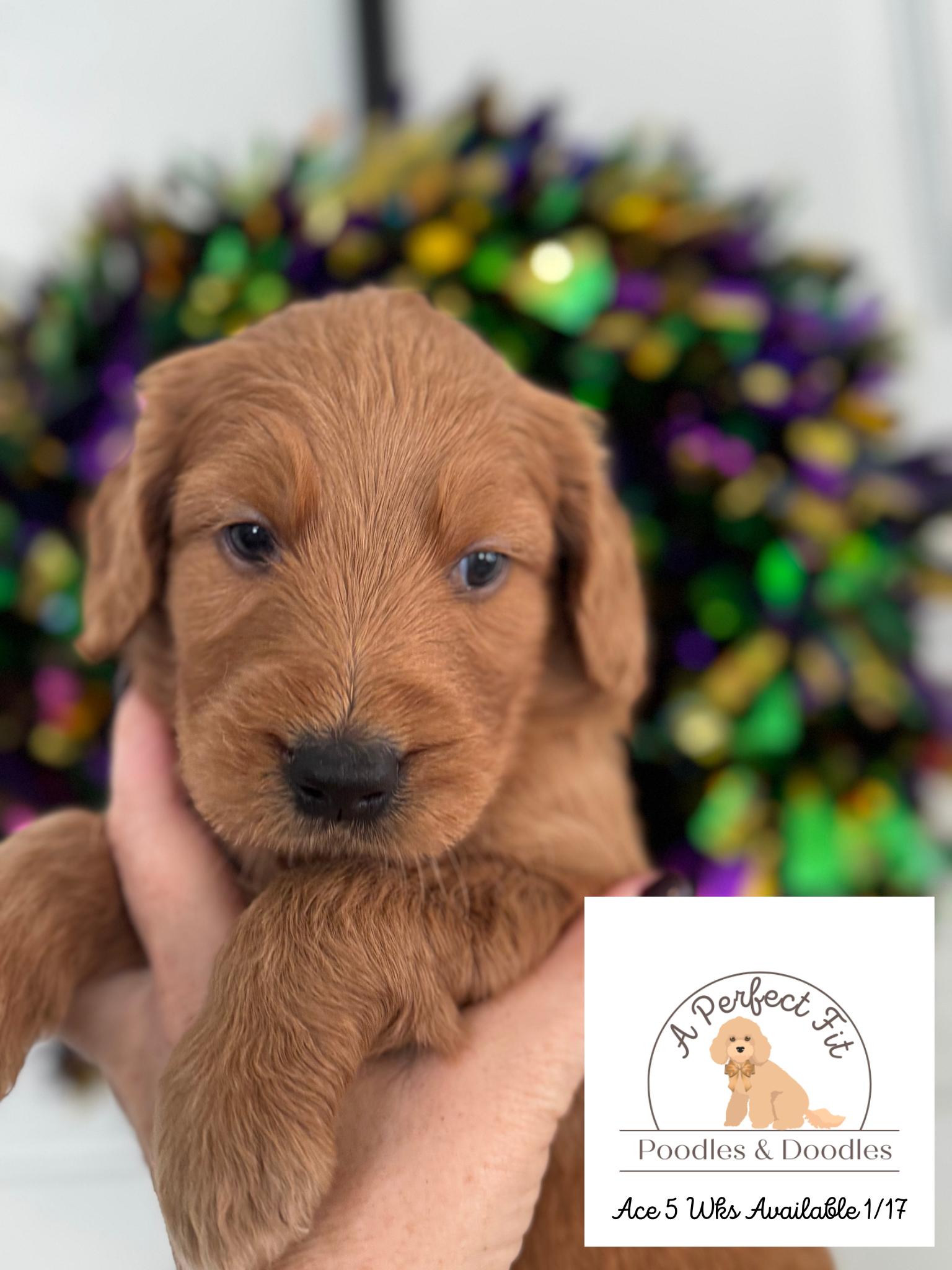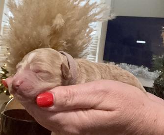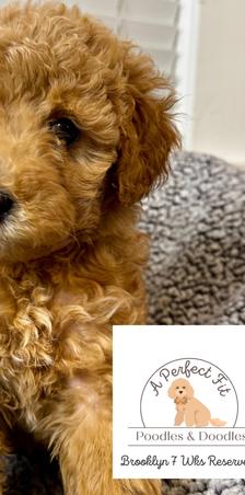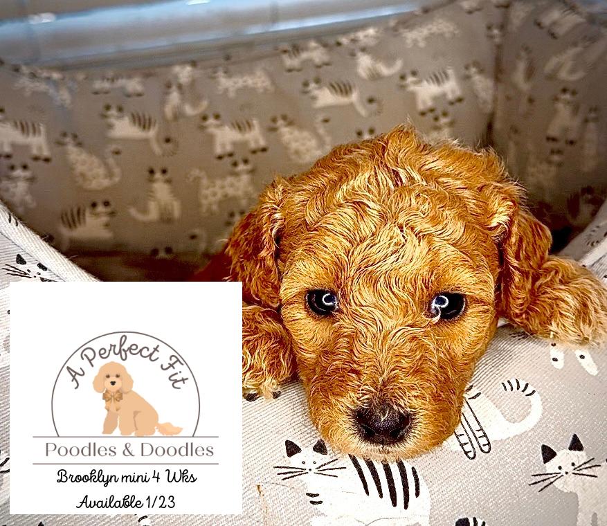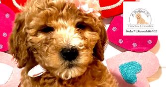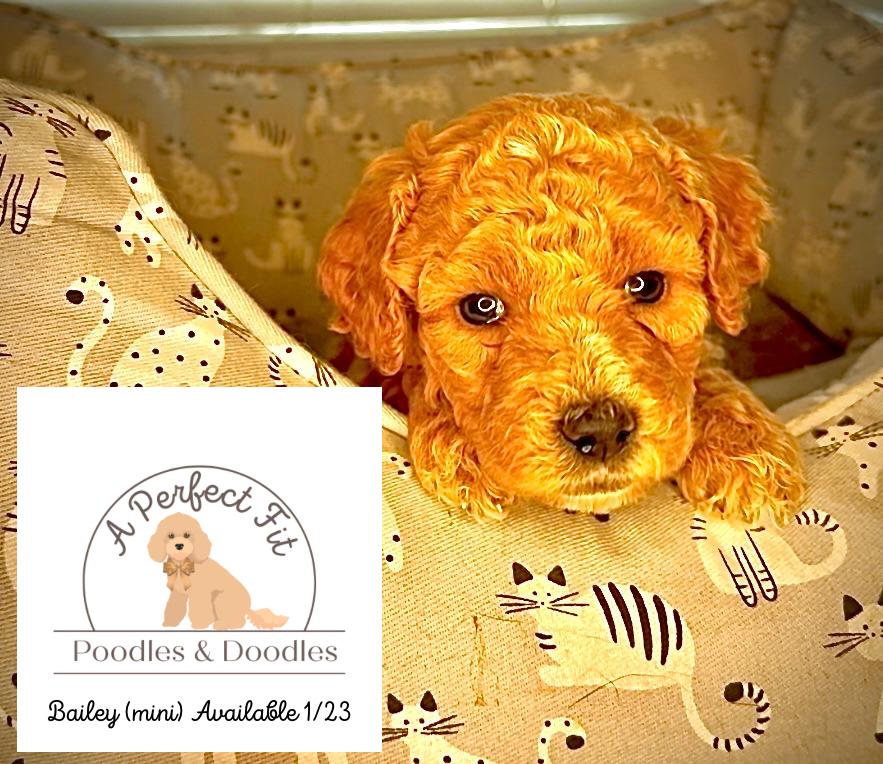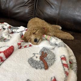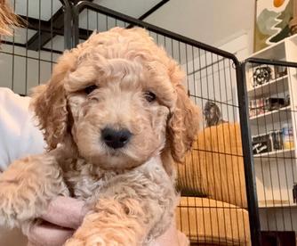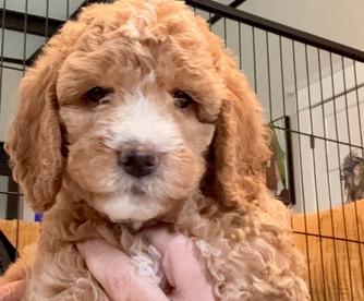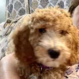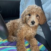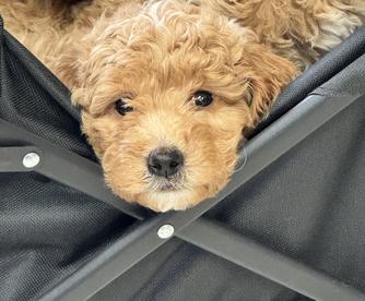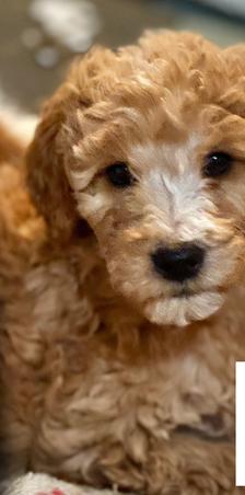 This beautiful mini Goldendoodle female is a tiny 15 pounds and full of charm. She has a rich apricot coat with soft, tight curls that are both eye-catching and low-shedding. Her expressive eyes and sweet, feminine features give her a gentle, intelligent look that perfectly reflects her temperament.